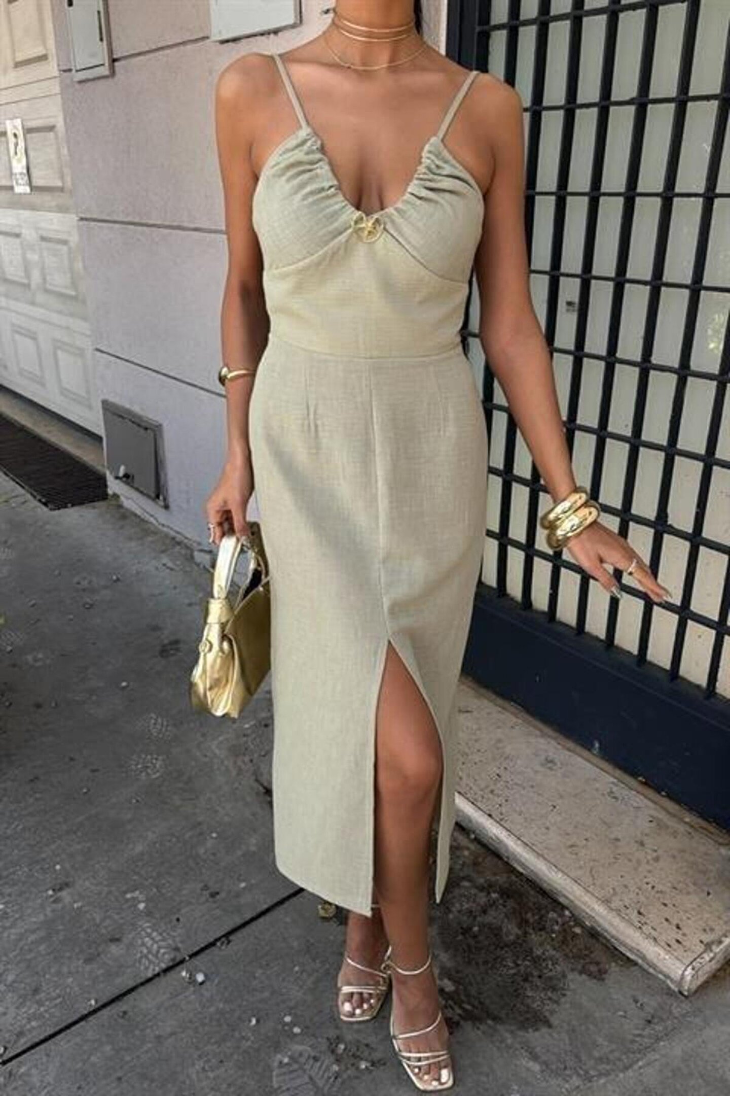 Göğsü Aksesuarlı Önü Yırtmaçlı Elbise 2899