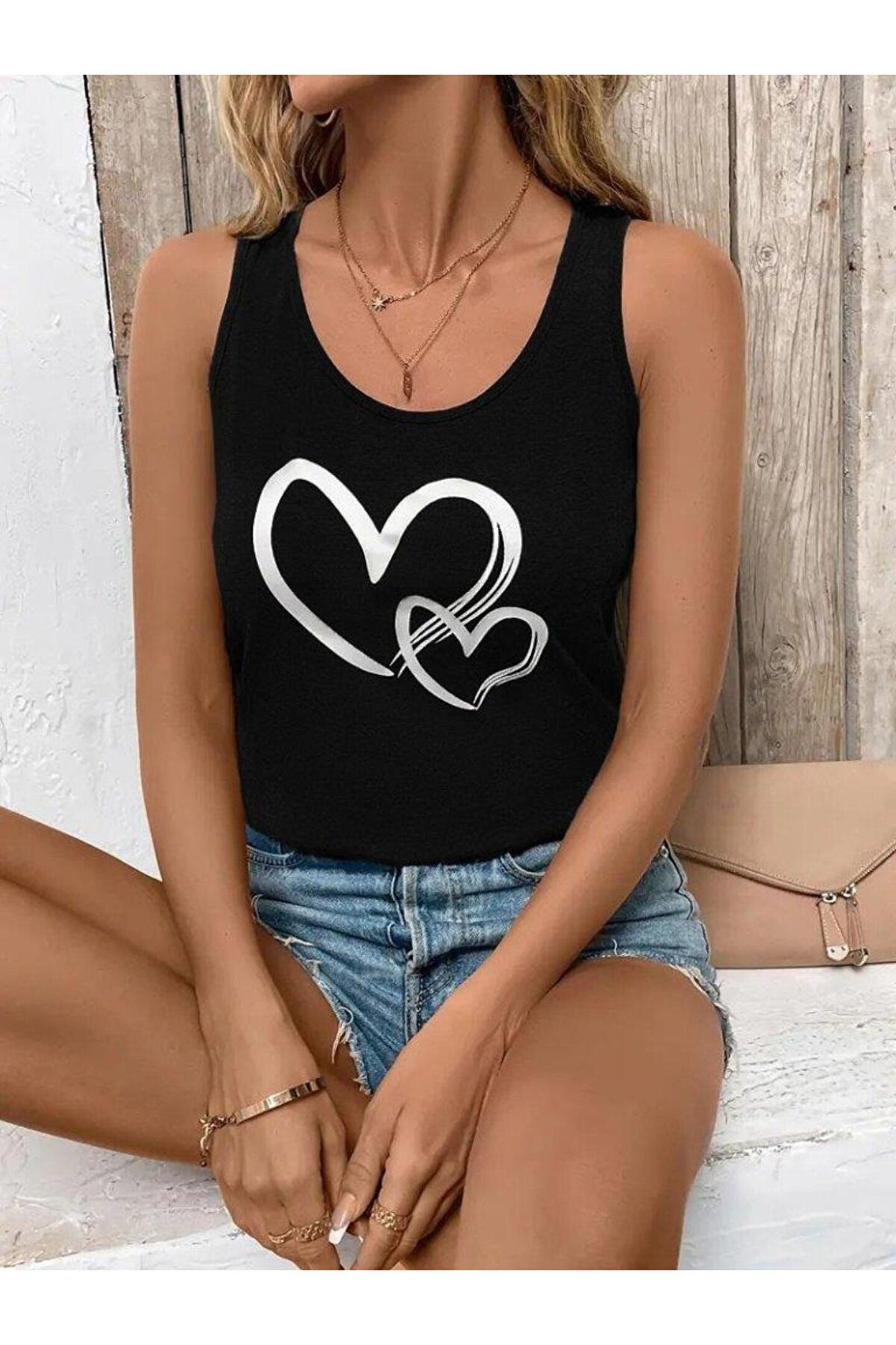Kadın Askılı Yuvarlak Yaka Kalp Baskılı Viskon Bluz