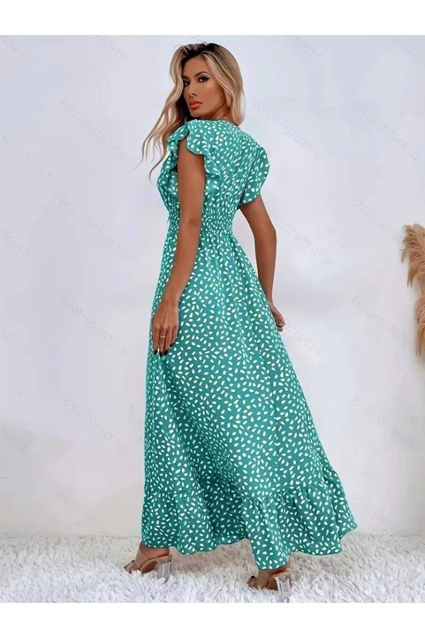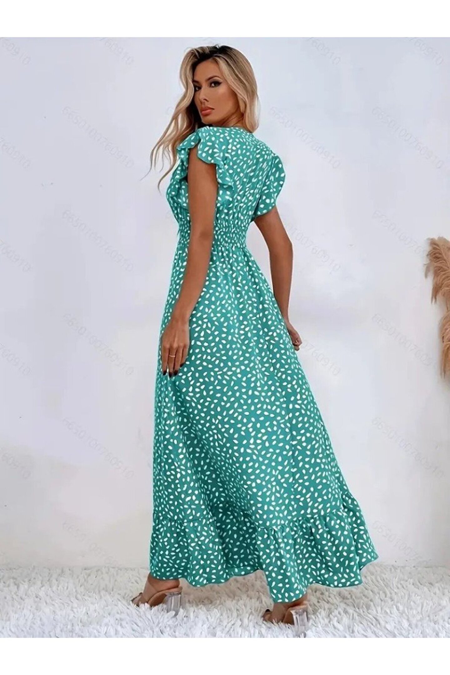 Kadın Kısa Kollu Kruvaze Yaka Beli Lastikli çiçek Desenli Elbise