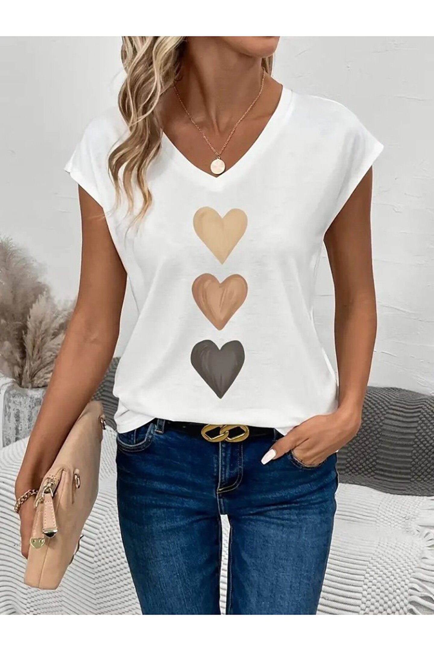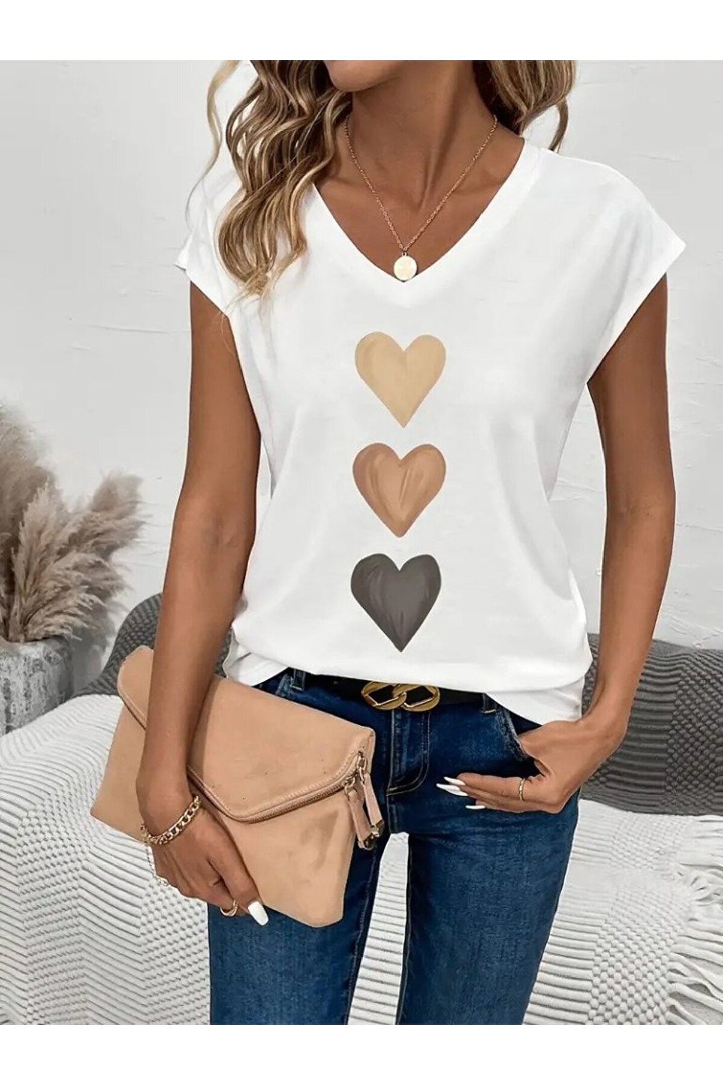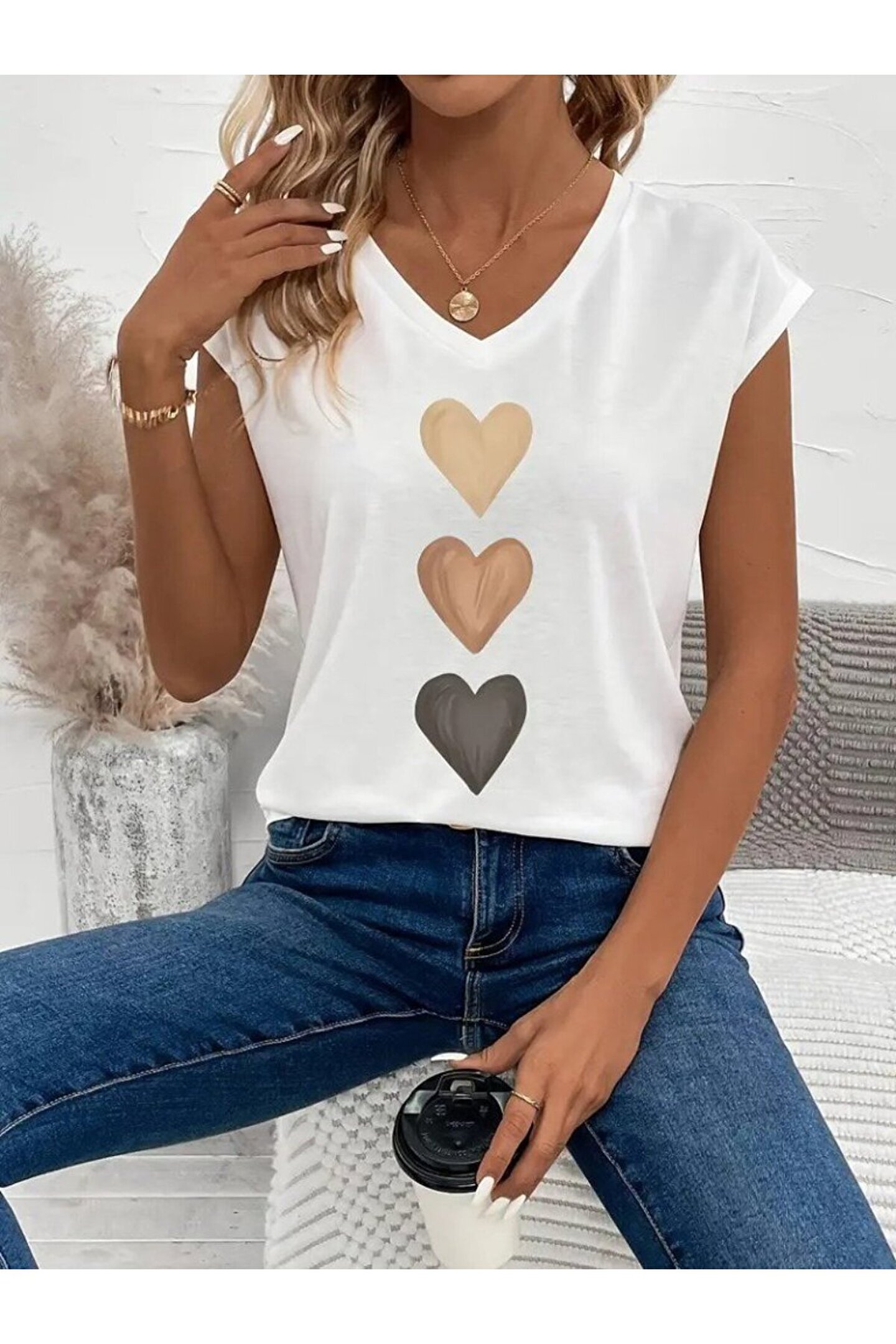 Kadın Kısa Kollu V Yakalı Kalp Desen Viskon Bluz