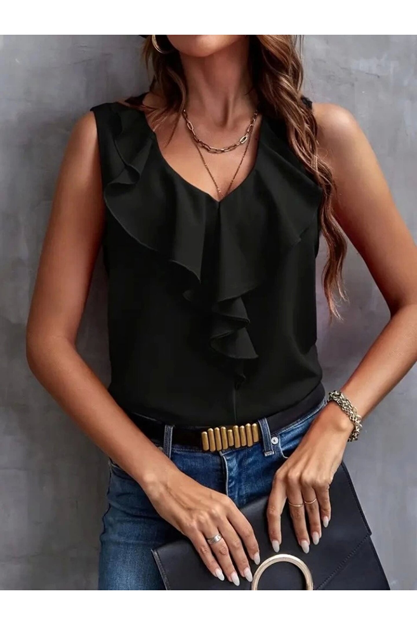 ETİLER COLLECTION Kadın Sıfır Kollu V Yakalı Volanlı Ithal Krep Bluz