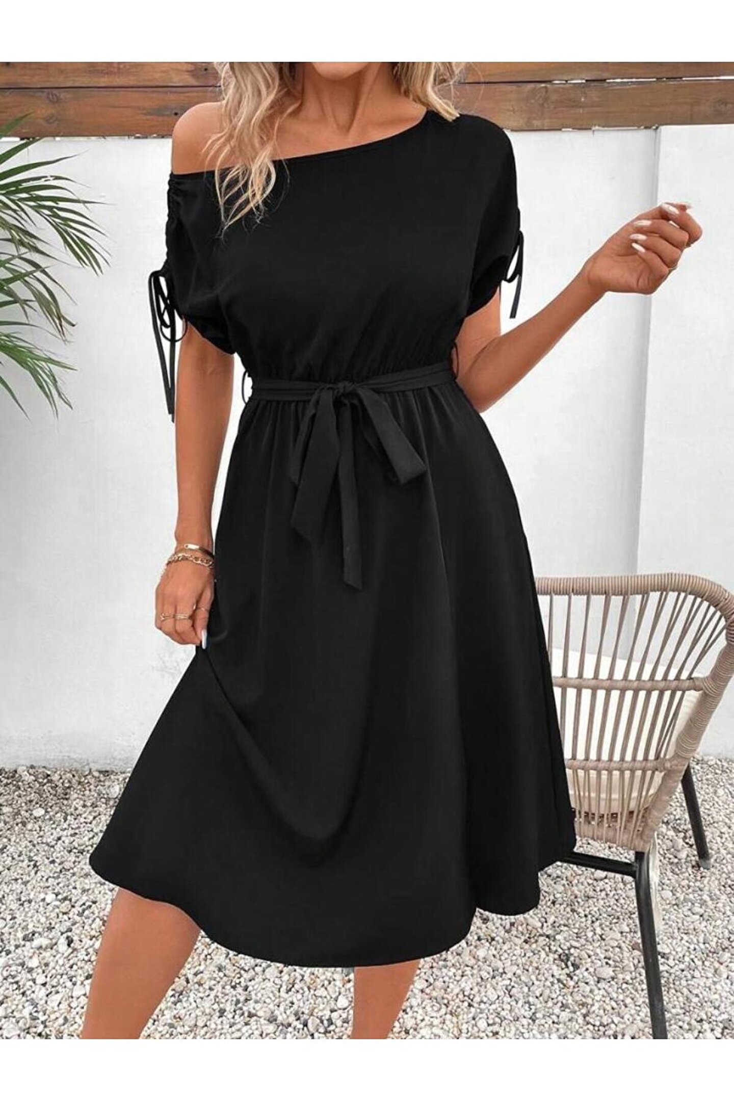 Kadın Tek Omuzu Açık Kol Ucu Fiyonklu Belden Kuşaklı Yırtmaç Detaylı Viskon Elbise