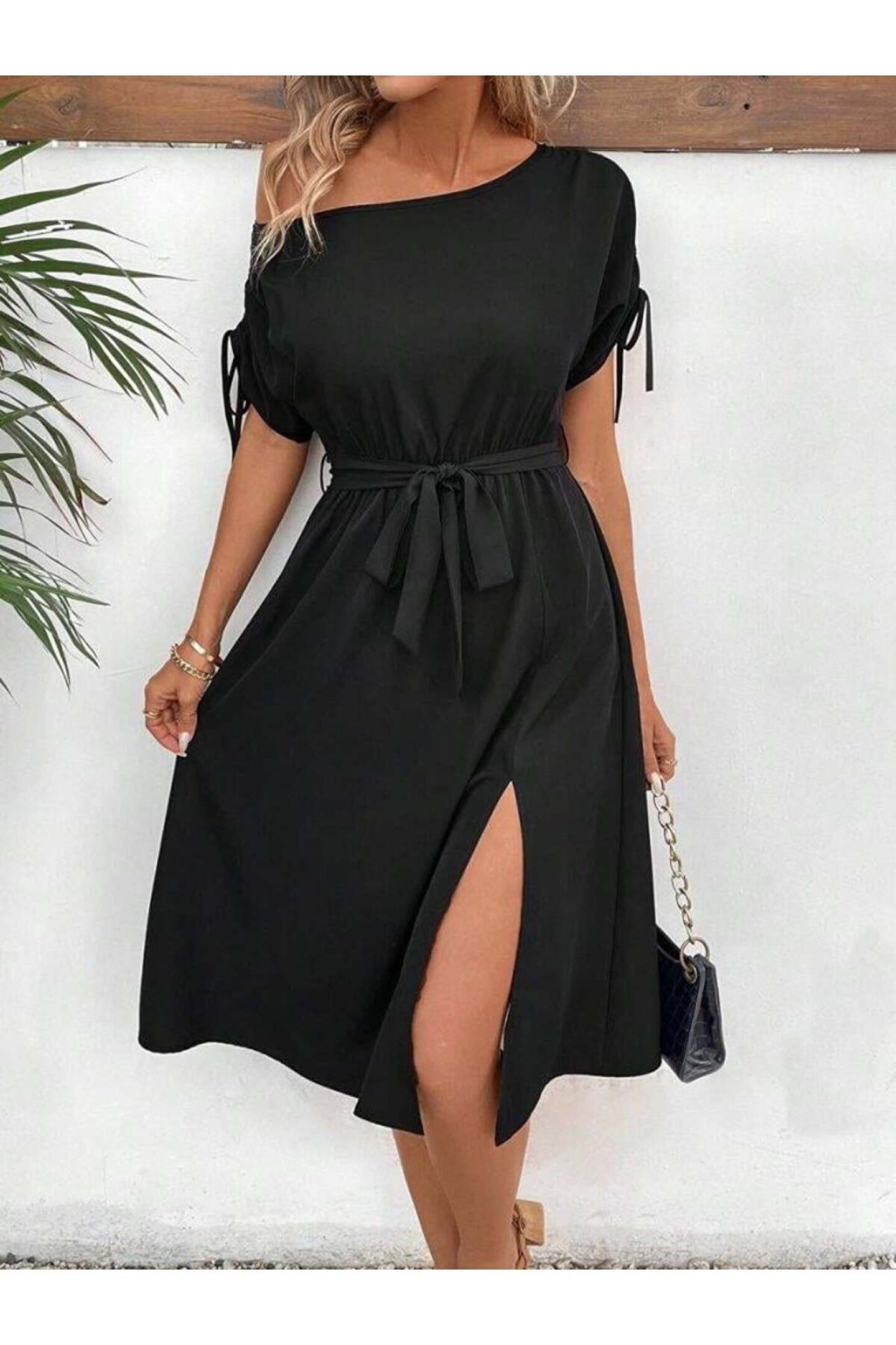 ETİLER COLLECTION Kadın Tek Omuzu Açık Kol Ucu Fiyonklu Belden Kuşaklı Yırtmaç Detaylı Viskon Elbise