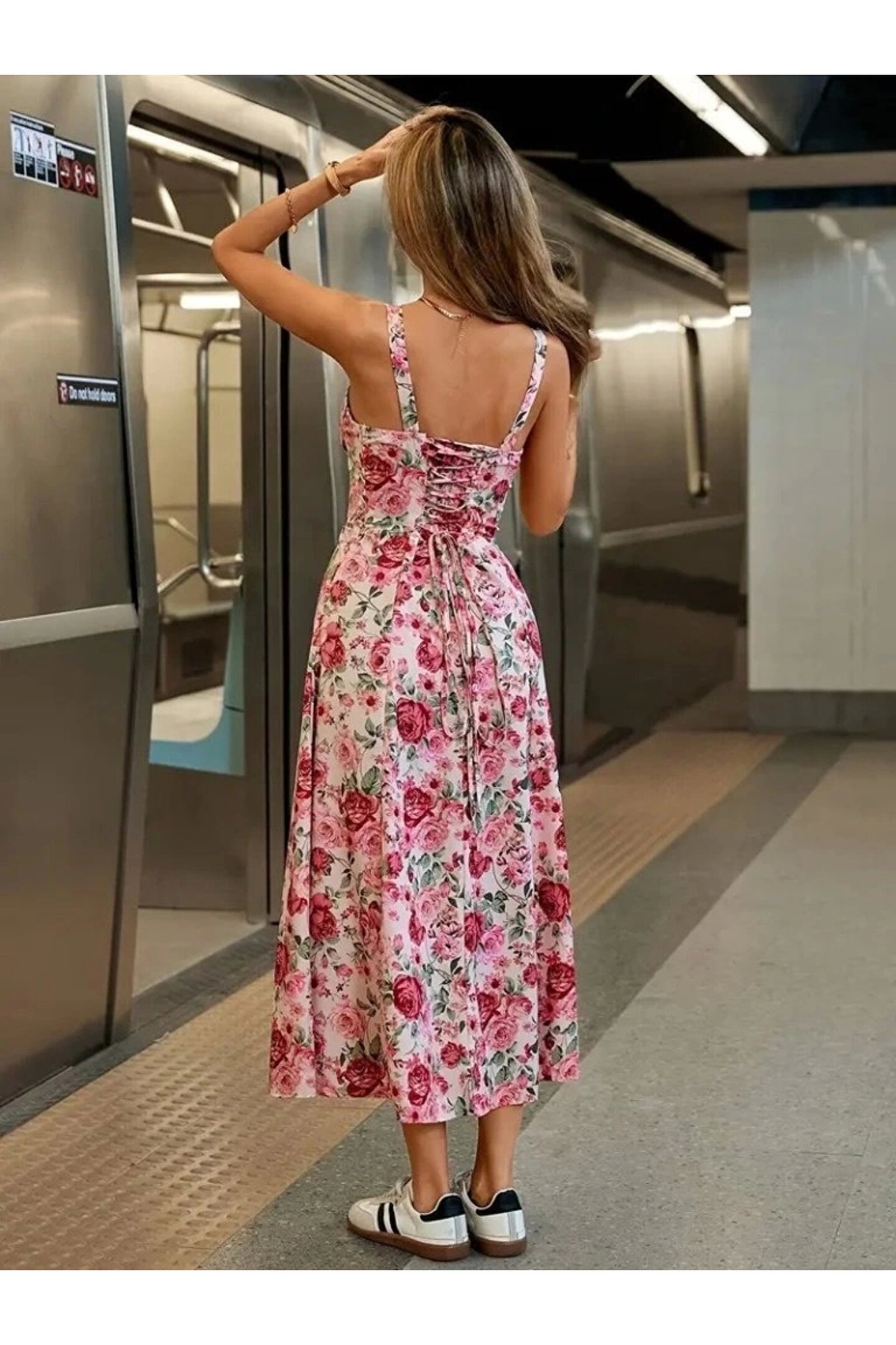 etol textile Kadın Askılı Geniş V Yakalı Sırttan Bağlamalı Yırtmaçlı Süprem Elbise