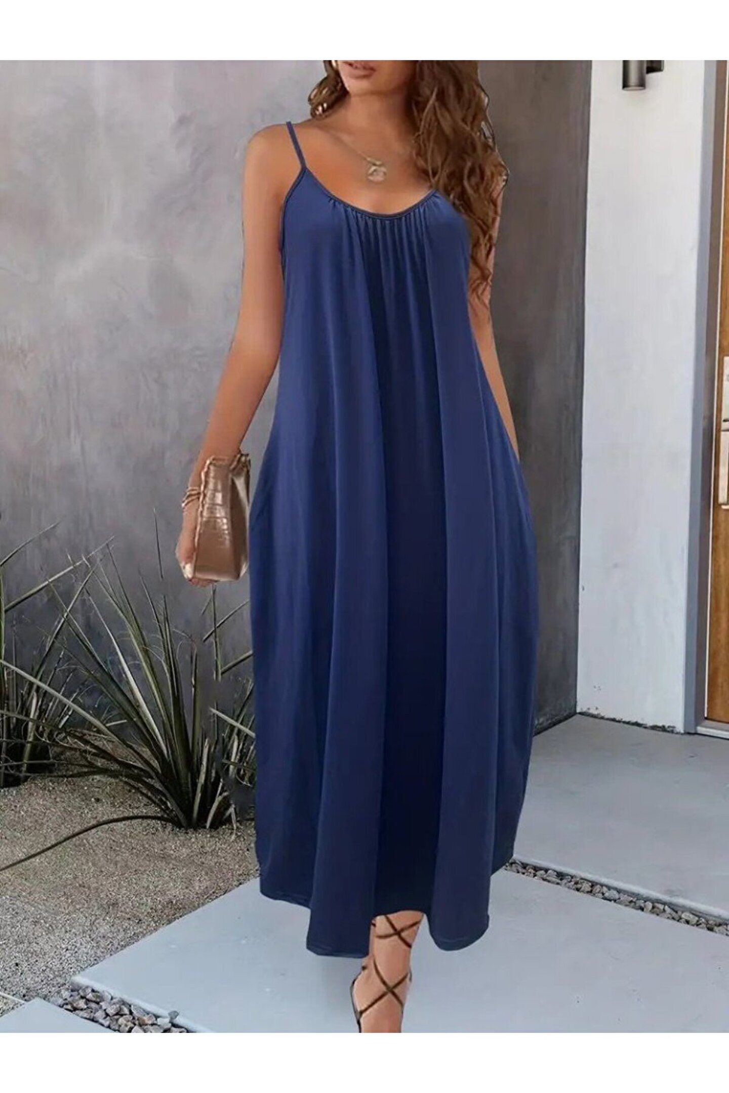 Kadın Ip Askılı Geniş V Yakalı Cepli Viskon Elbise