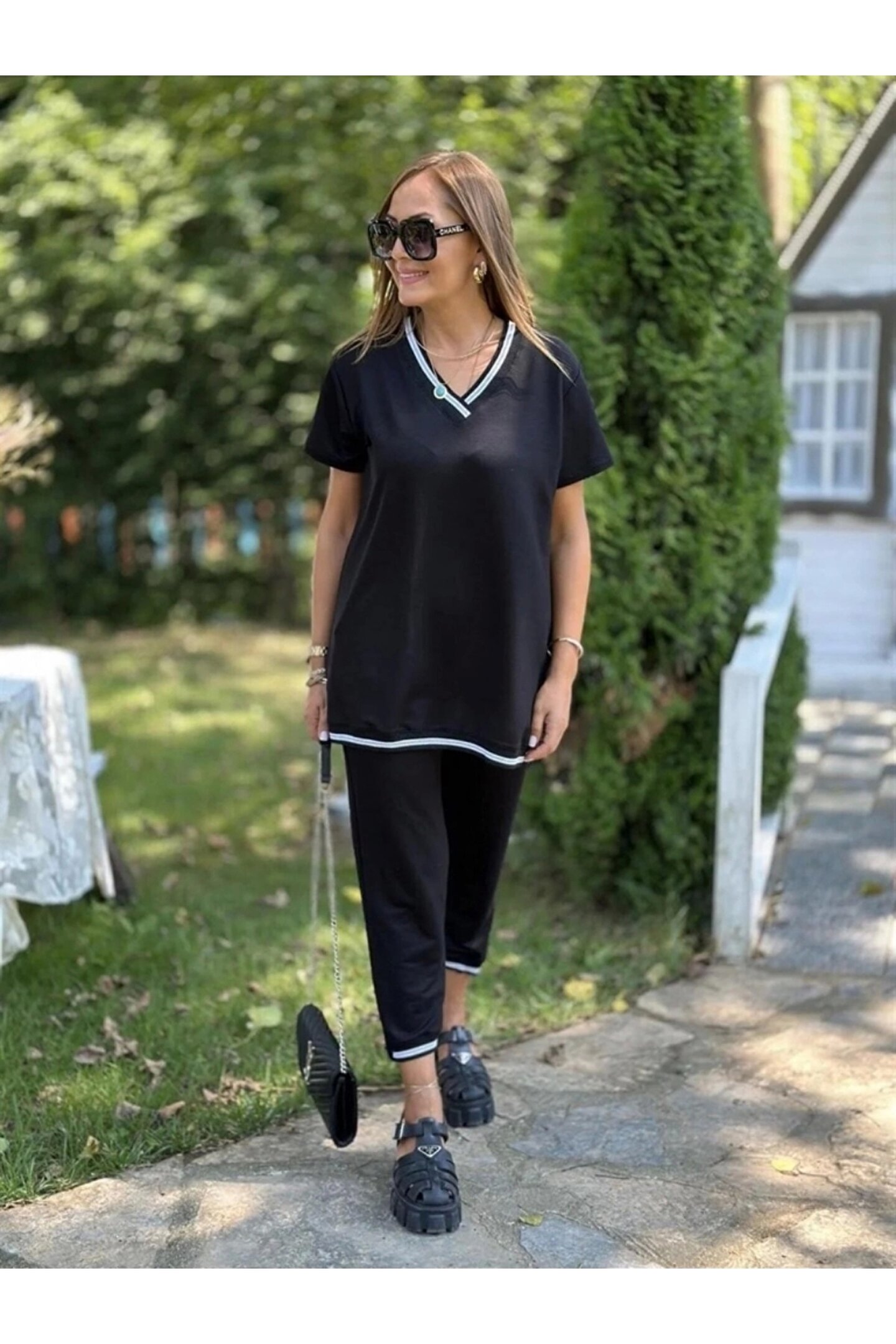 Kadın Kısa Kollu V Yakalı Iki Iplik Bluz Ve Pantolon Ikili Takım
