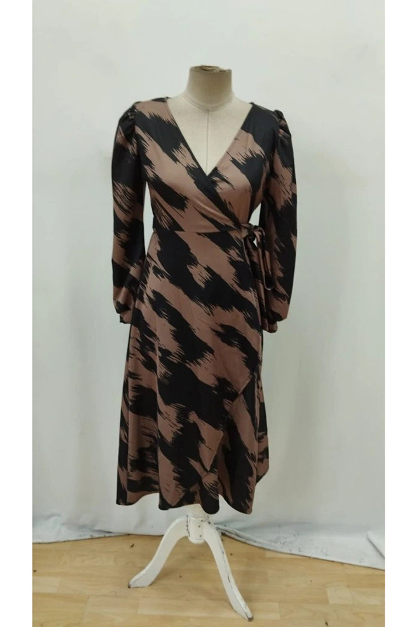 Kadın Uzun Kollu Kruvaze Yakalı Yandan Bağlamalı Desenli Mini Modal Elbise