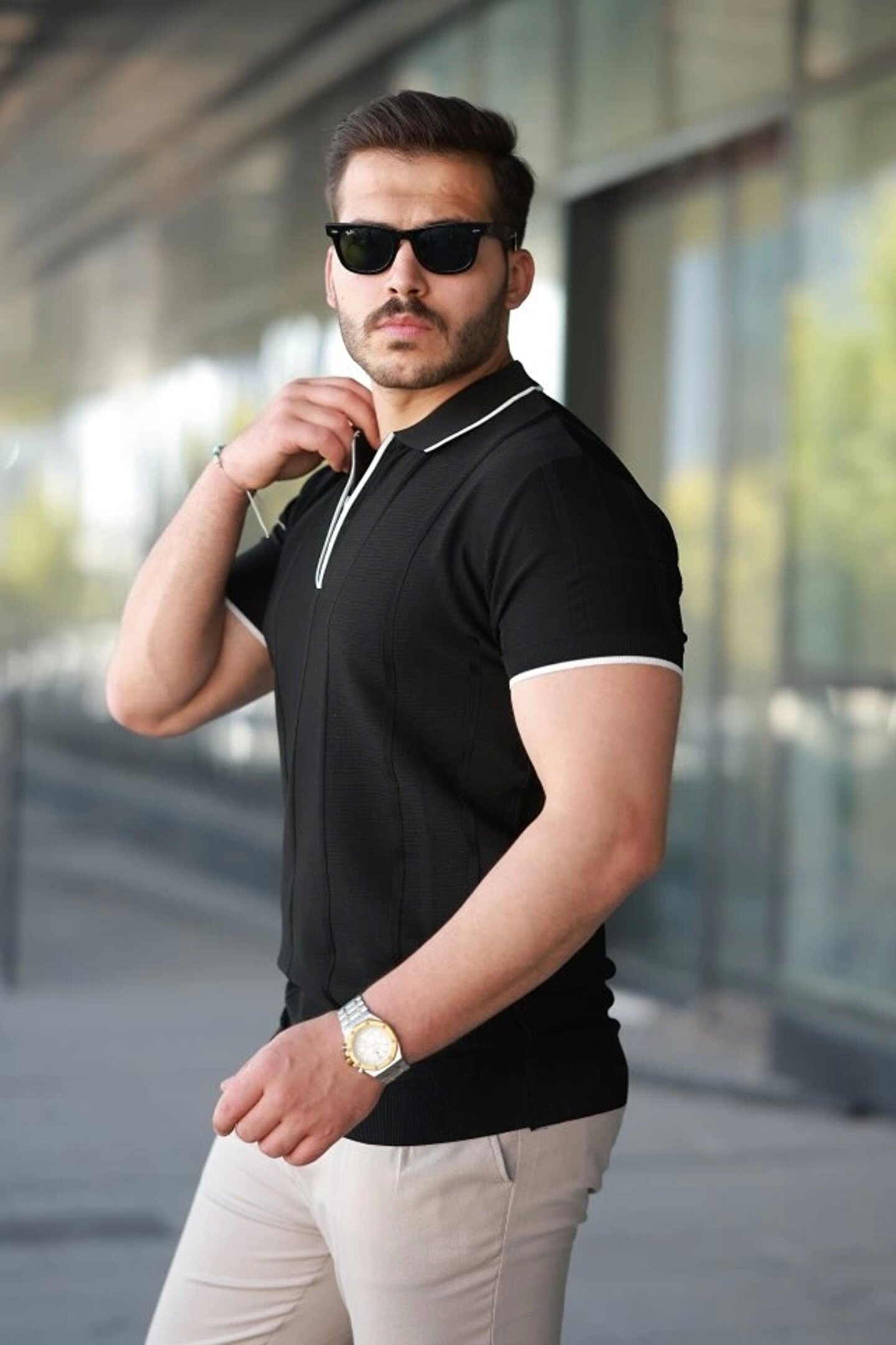 Erkek Dikey Kabartmalı Örgü Dokulu Fermuar Yakalı Tişört