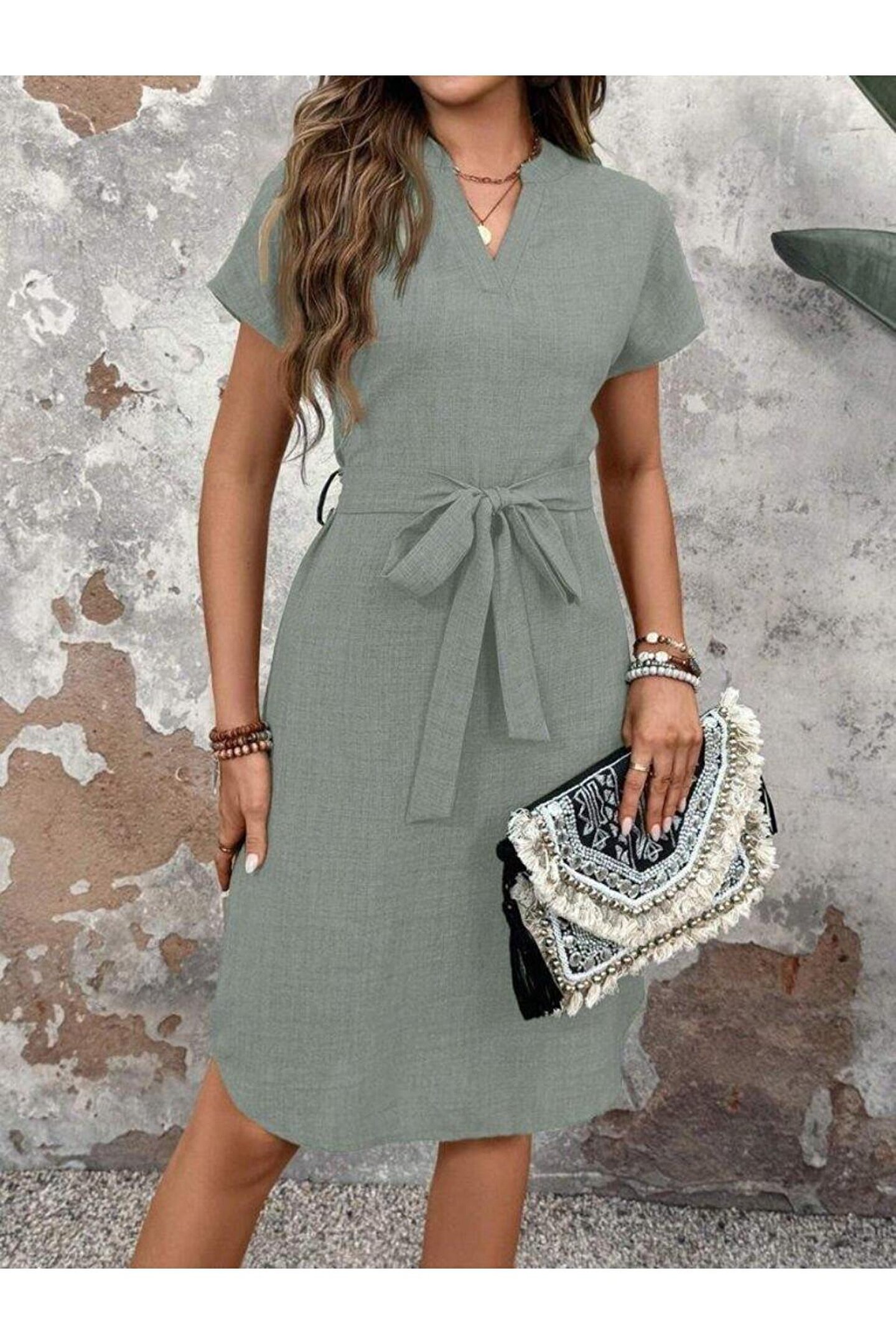 EyesOf Kadın Kısa Kollu V Hakim Yaka Belden Kuşaklı Valencia Elbise