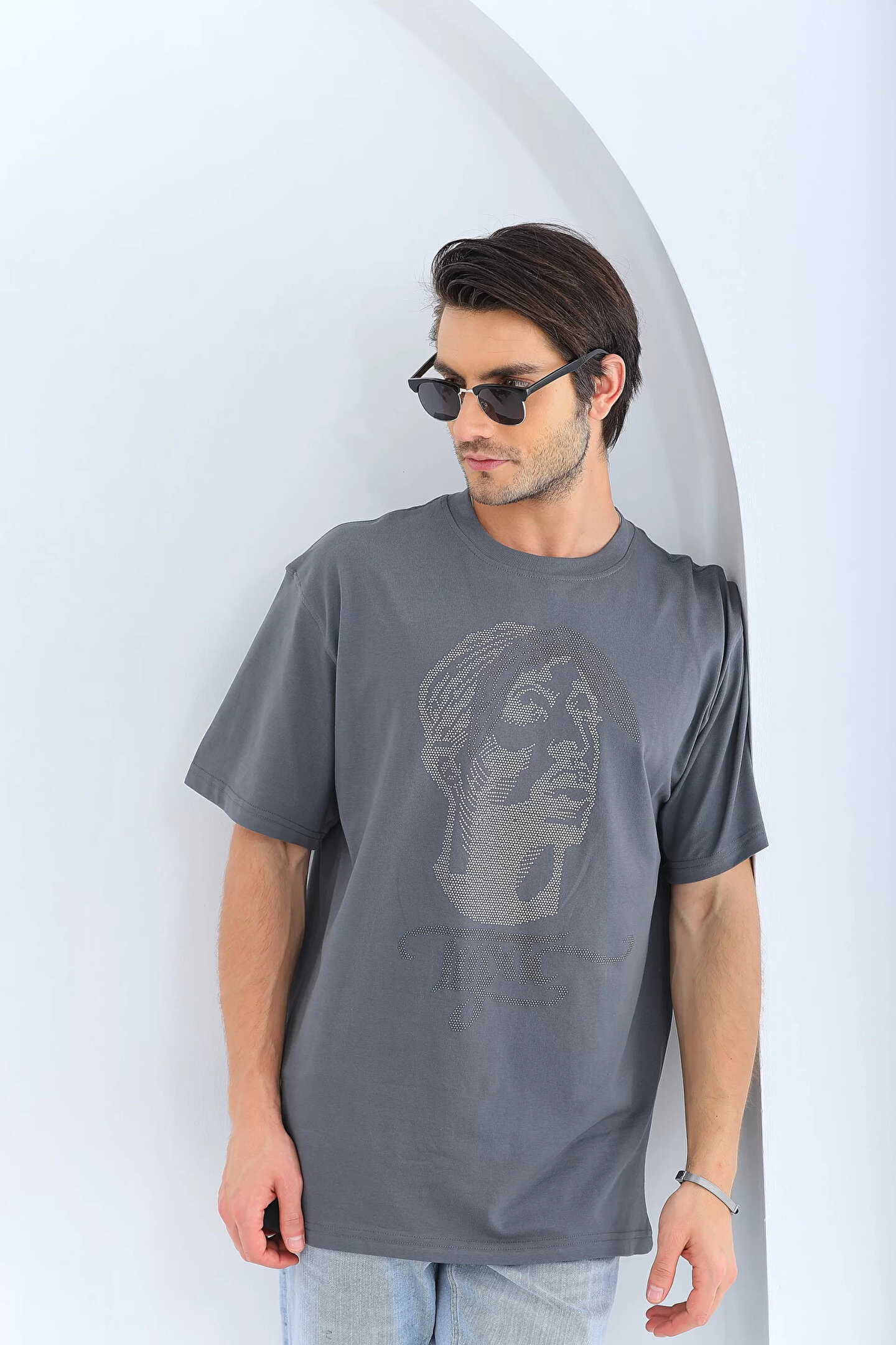 FantaziAtölyesi Unisex Oversize Taşlı Bisiklet Yaka T-Shirt - Füme