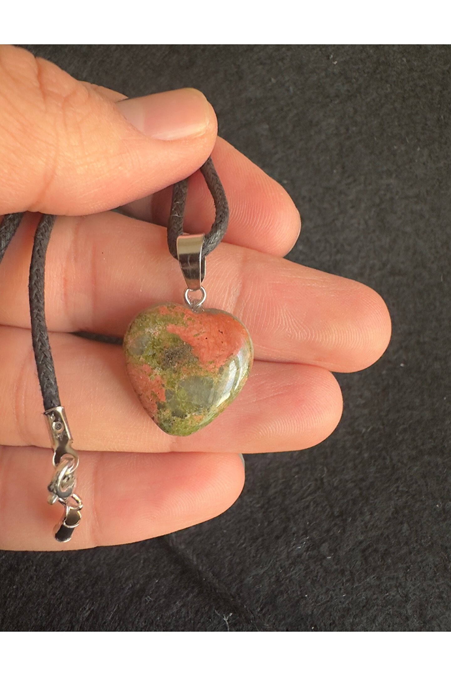 Kalp kesim Unakit taşı kolye uçu modelidir.; Klipsli Kolye ipi ile beraber gönderim sağlanır.