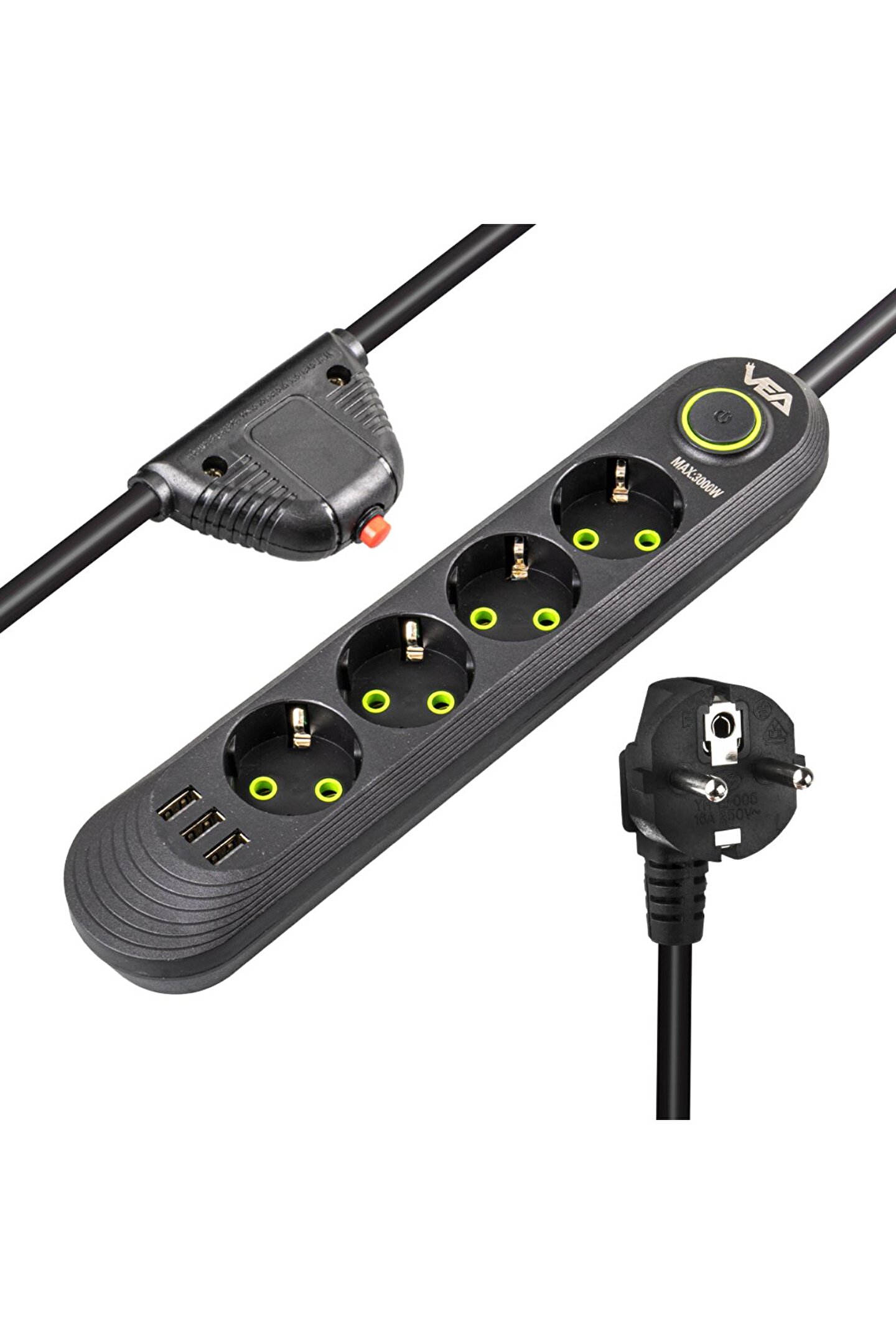 VA-21559 4LÜ 1.5 METRE KABLOLU 3 USBLİ SİYAH AKIM KORUMALI PRİZ