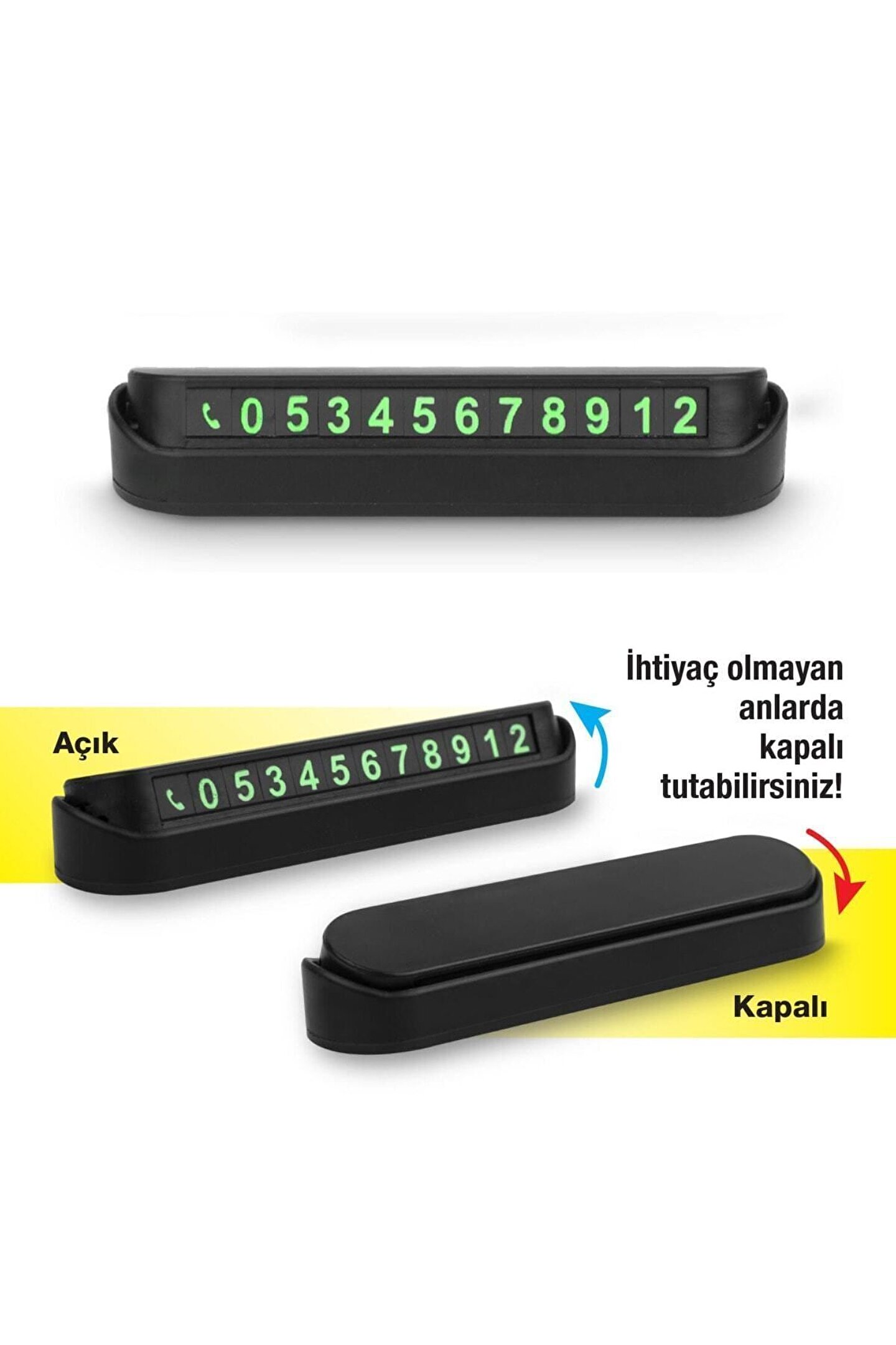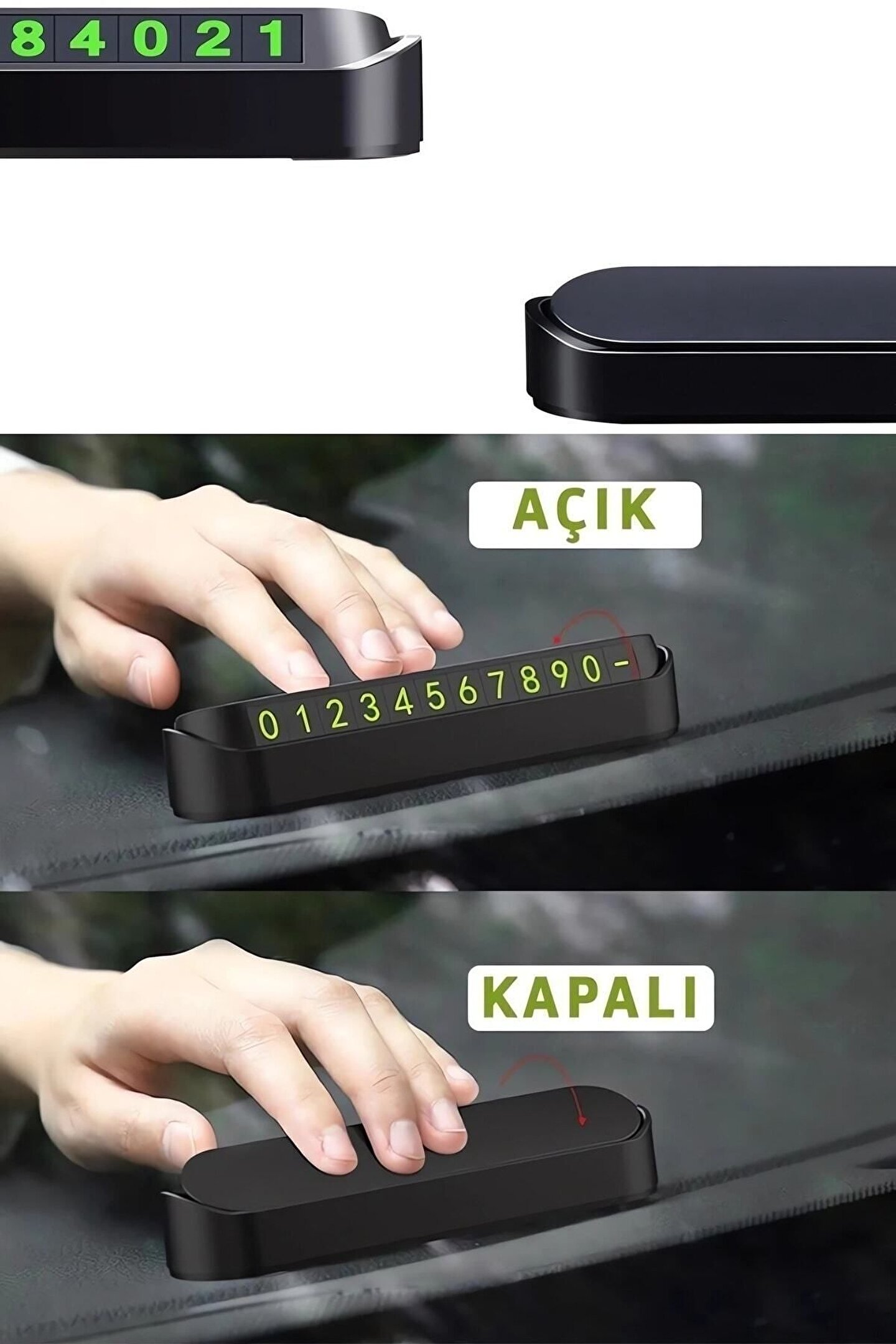 Aveo 1 Adet Pratik Aç-Kapa Sistemi: İhtiyaç duyduğunuzda numaranızı görünür hale getirir, istemediğinizde kapatarak gizleyebilirsiniz.; Sürüş güvenliği ve kişisel gizlilik için ideal bir çözümdür.; ; Şık ve Modern Tasarım: Araç içi dekorasyonuna uyum sağlayan estetik bir görünüme sahiptir.; Kompakt boyutu sayesinde ön camda fazla yer kaplamaz.; ; Kolay Uygulama: Yapıştırıcı tabanı sayesinde araç ön paneline kolayca sabitlenir.; Dilerseniz söküp başka araca da taşıyabilirsiniz.; ; Değiştirilebilir Numara Etiketleri: Ürünle birlikte gelen rakam etiketleri sayesinde telefon numaranızı kolayca oluşturabilirsiniz.; Sayılar net ve okunaklıdır.; ; Dayanıklı Malzeme: Isı ve güneş ışığına karşı dayanıklı plastikten üretilmiştir.; Uzun süreli kullanımda solma veya deformasyon yapmaz.; ; Ev, iş yeri ya da misafirlikte kolay iletişim: Park ettiğiniz yerde ulaşılabilir olmak için ideal bir çözümdür.; Özellikle kalabalık alanlarda büyük kolaylık sağlar.