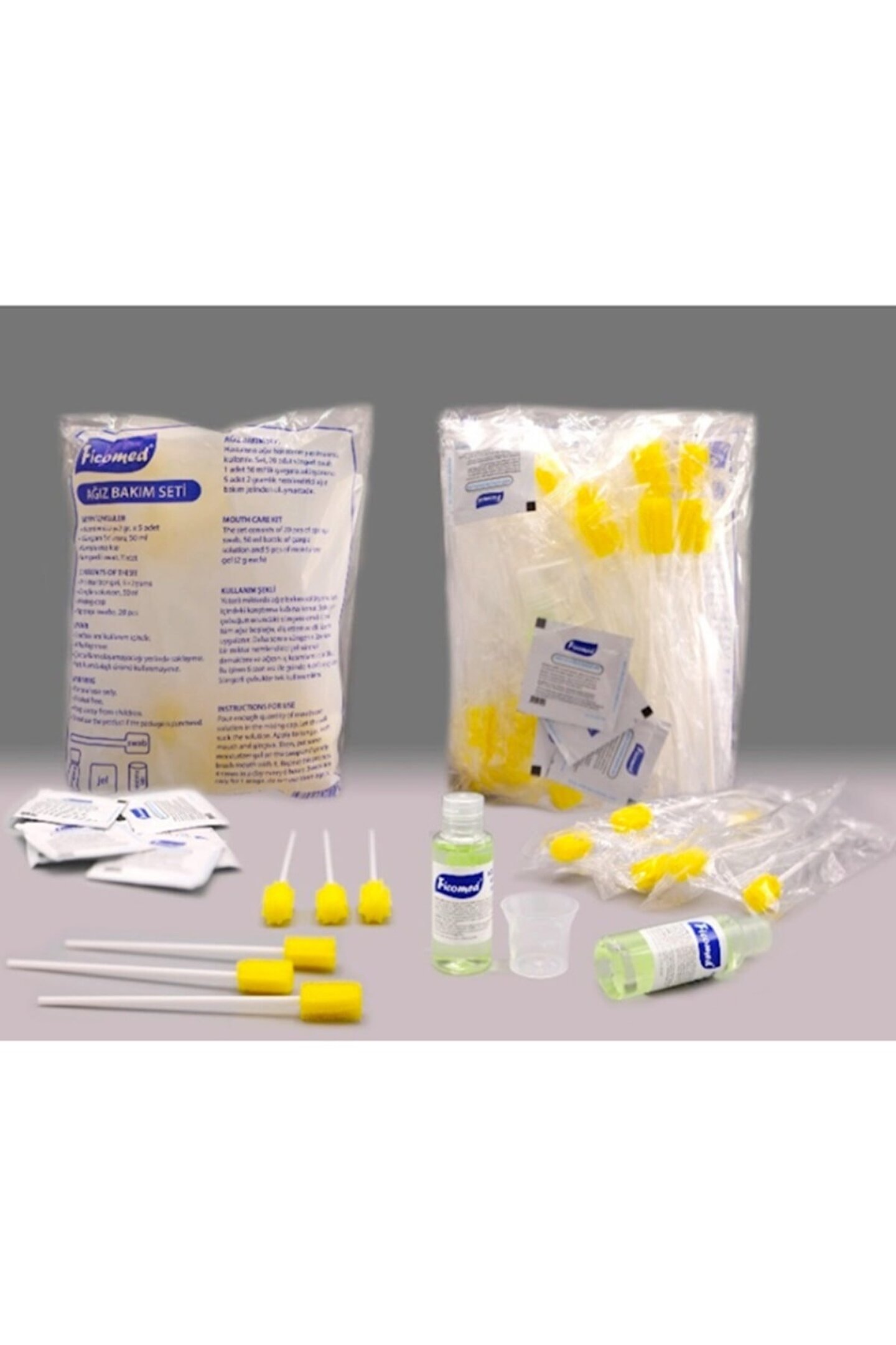 Ficomed ağız bakım seti kutulu ambalajda 20 li set Ficomed ağız bakım seti nedir;Ficomed ağız bakım seti yatarak tedavi gören hastalarda veya kendi bakımını yapamayan kişilerde ağız içi temizliğinde kullanılır;Ürün ağız içinde gelişen zararlı mikroorganizmaları yok eder;Özel formülü sayesinde ağız kuruluğunu engeller ve ağız içinde bulunan yaralardan kaynaklanan ağrıları hafifletir;Bu özellikleri sayesinde riskini azaltmaktadır;Ayrıca ficomed ağız bakım seti ağız içinde temizlik ve ferahlık sağlar;Bu ürün sadece yetişkinler içindir, bebeklerde kullanıma uygun değildir;Solüsyonun kimyasal içeriği Solüsyonun kimyasal içeriğinde deionized water, sorbitol, natural glycerin, polysorbate-20, sodium saccarine, sodium benzoate ve şavour bulunmaktadır;Jelin kimyasal içeriği Jelin kimyasal içeriğinde deionized water, hydroxy ethyl cellulose, glycerin, mint, citric acid, propyl paraben ve methyl paraben bulunmaktadır;Saklama koşulları 35°c’nin altında, güneş ışığından uzakta, serin bir yerde muhafaza edilmelidir;Kullanım şekli Bir miktar ağız temizleme solüsyonu kutu içindeki ölçü kabına konur;Ölçü kabındaki solüsyonun içine, ucunda sünger bulunan çubuk daldırılır ve süngere ağız temizleme solüsyonu emdirilir;Sonrasında tüm ağız boşluğu, diş etleri ve dil temizlenir;Bu işlemden sonra süngere bir miktar nemlendirici jel konur ve ağız boşluğuna sürülür;Bu temizleme ve bakım işlemi ağız içinin temiz, nemli ve ferah kalmasını sağlar;Günde 4 defa ağız temizliği ve bakımı yapılması önerilmektedir