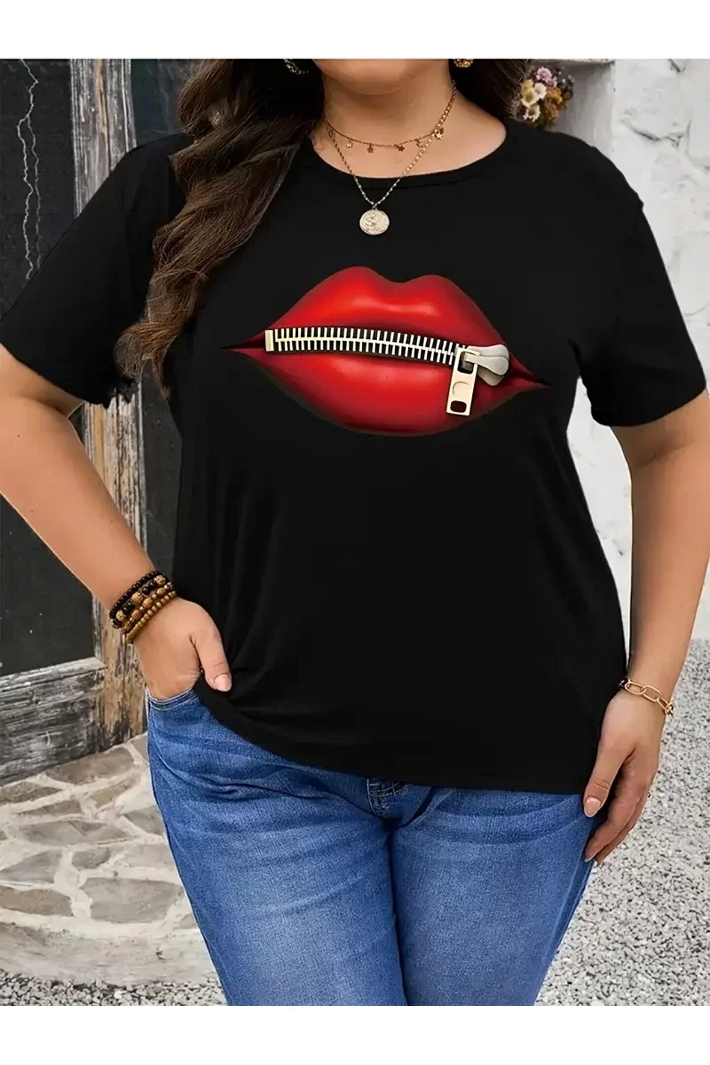 fermuar dudak baskılı tişört bisiklet yaka kısa kollu tişört - Siyah