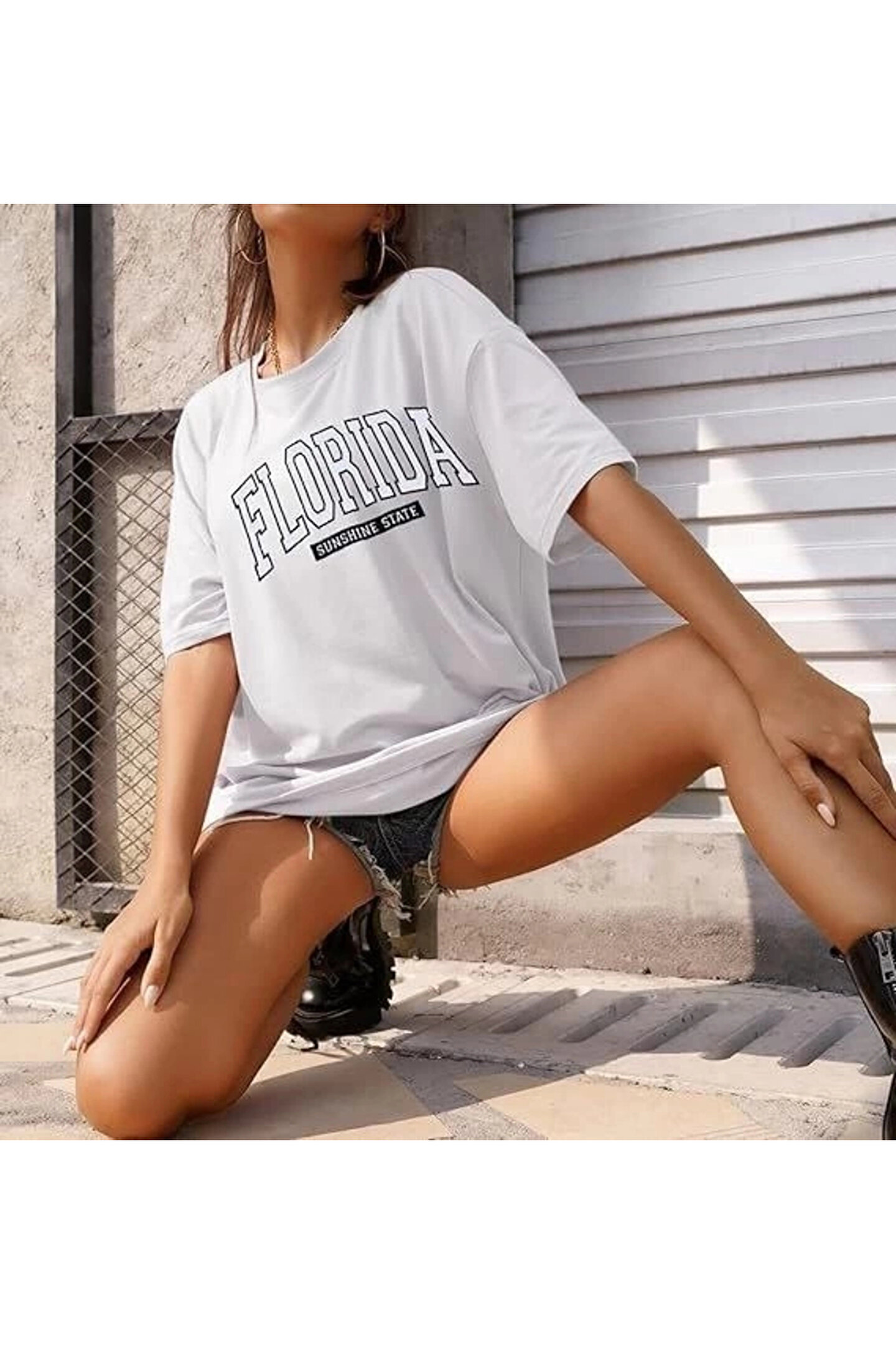 Flexium Kadın Bisiklet Yaka Baskılı Beyaz T-shirt