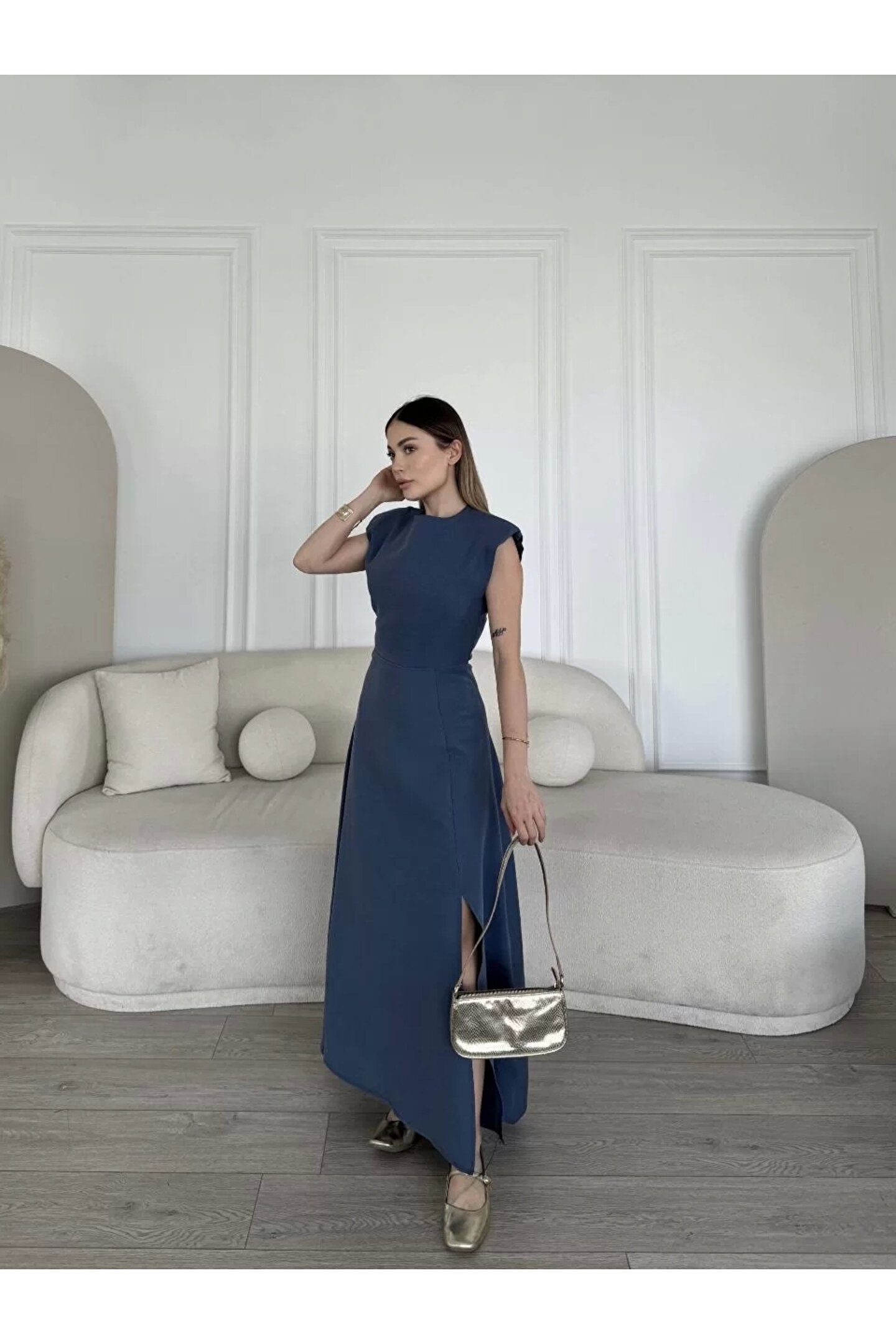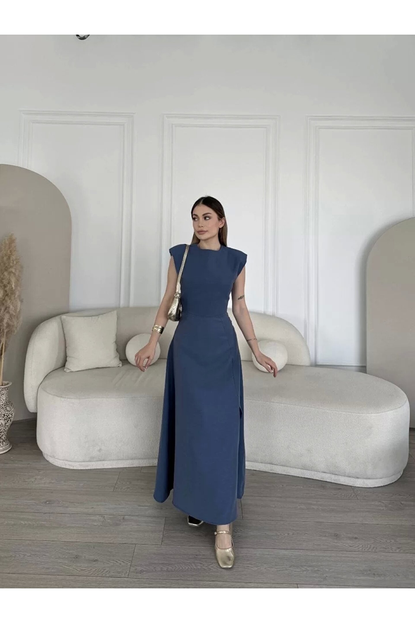 Keten Yandan Yırtmaçlı Uzun Sıfır Kolsuz Elbise - Mavi