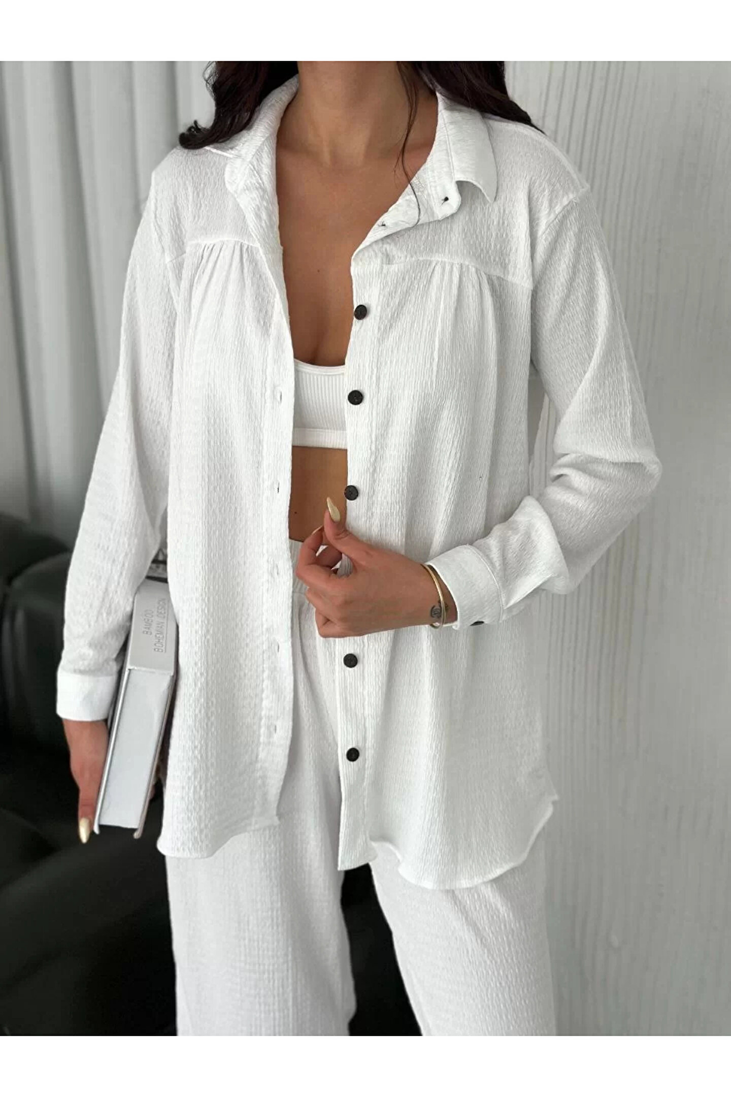 Flexium Yakalı Düğmeli Uzun Kollu Gömlek Pantolon ikili Takım - Beyaz