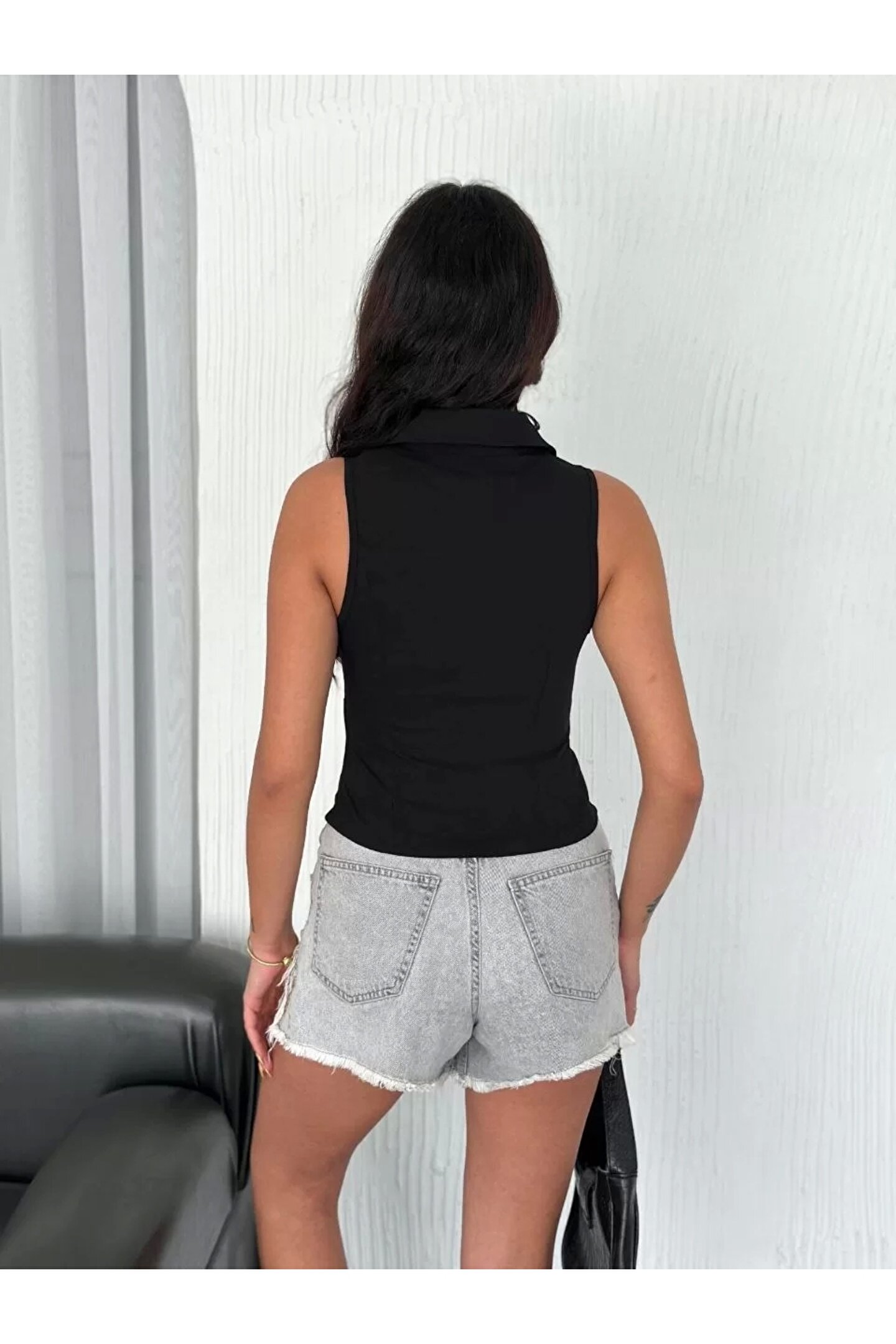 Yakalı Tam Fermuarlı Kolsuz Bluz - Siyah