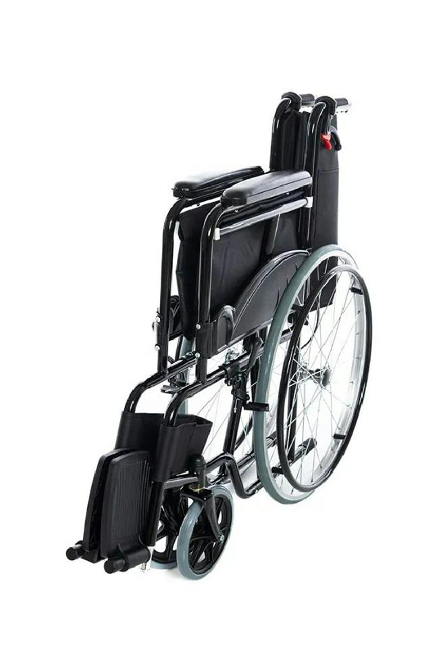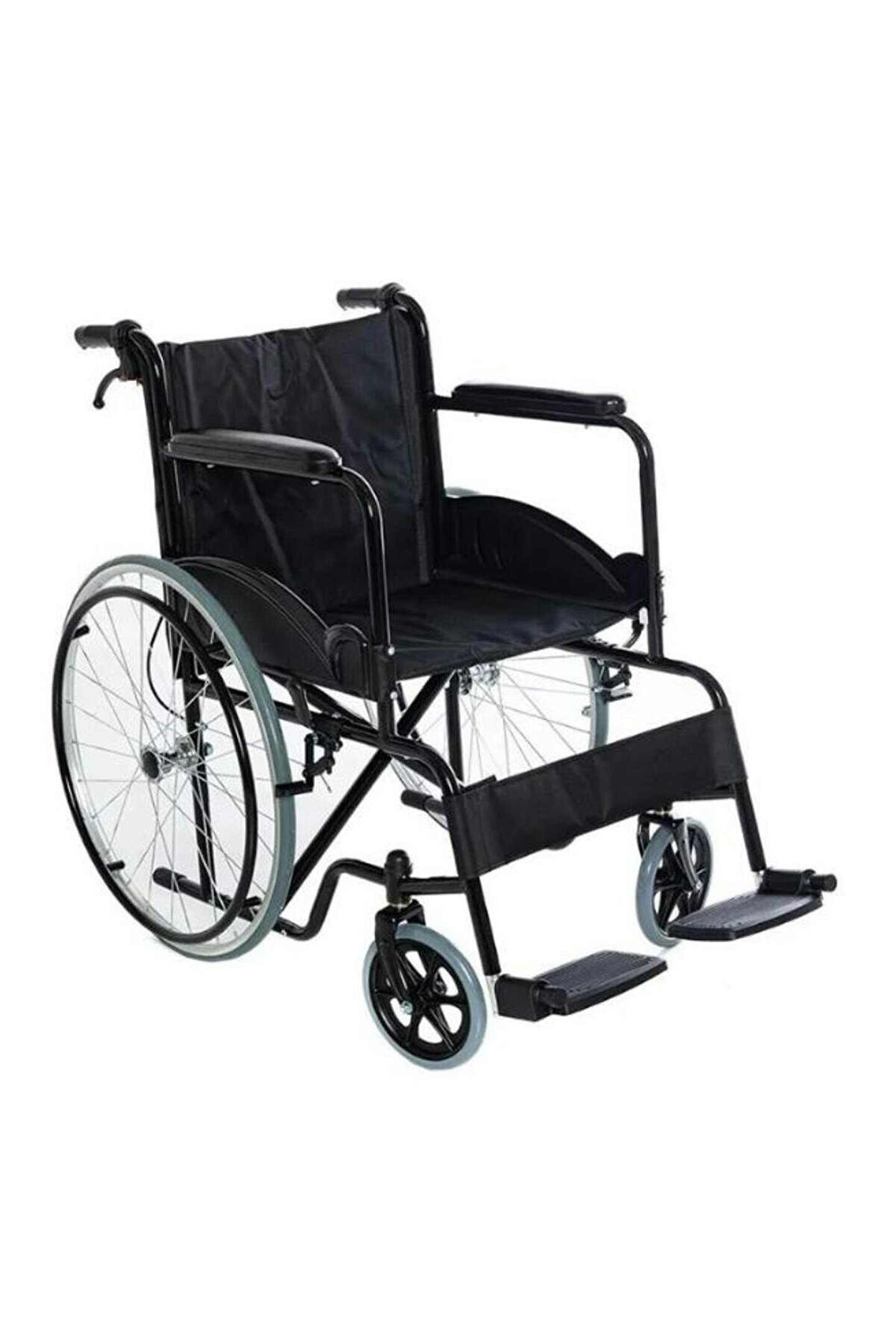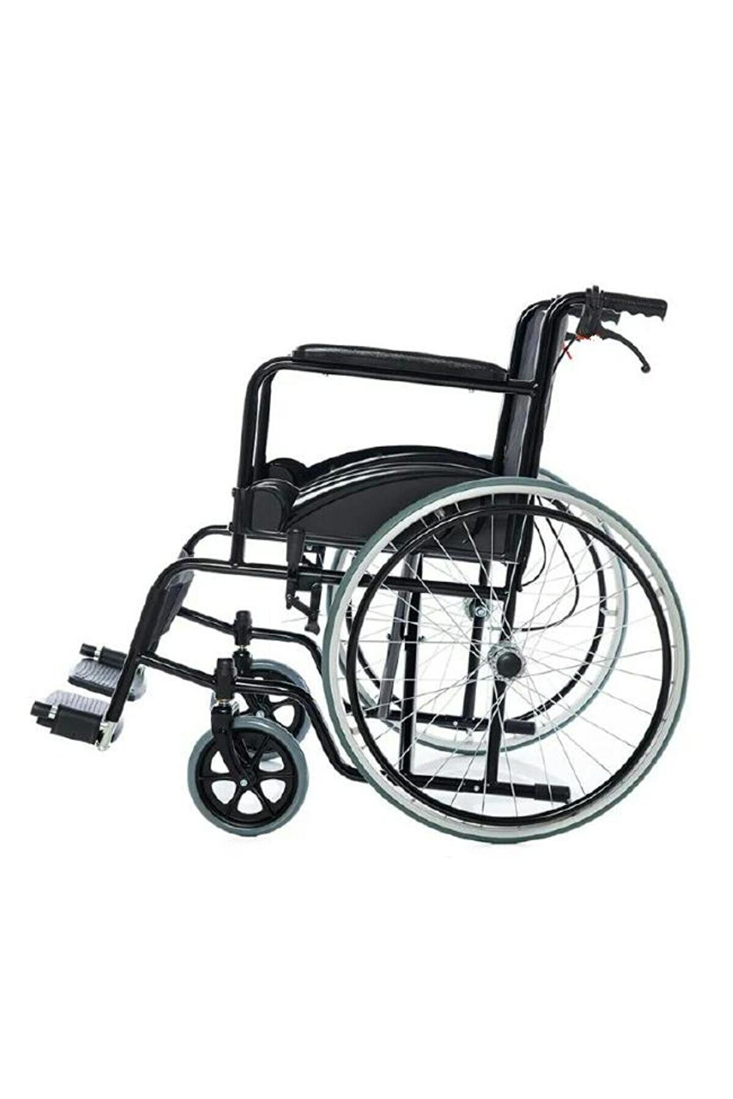 Özellikler: Refakatçi Frenli, Manuel tekerlekli sandalye Karbon çelik şasi, elektrolizle yüzey işleme. ; Çelik tekerlek göbeği, poliüretan dolgu lastik. ; PVC ön tekerlek. ; Yüksek kaliteli paraşüt kumaş .;