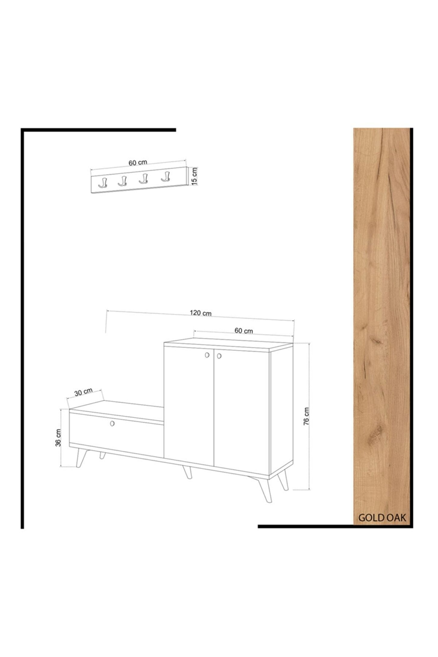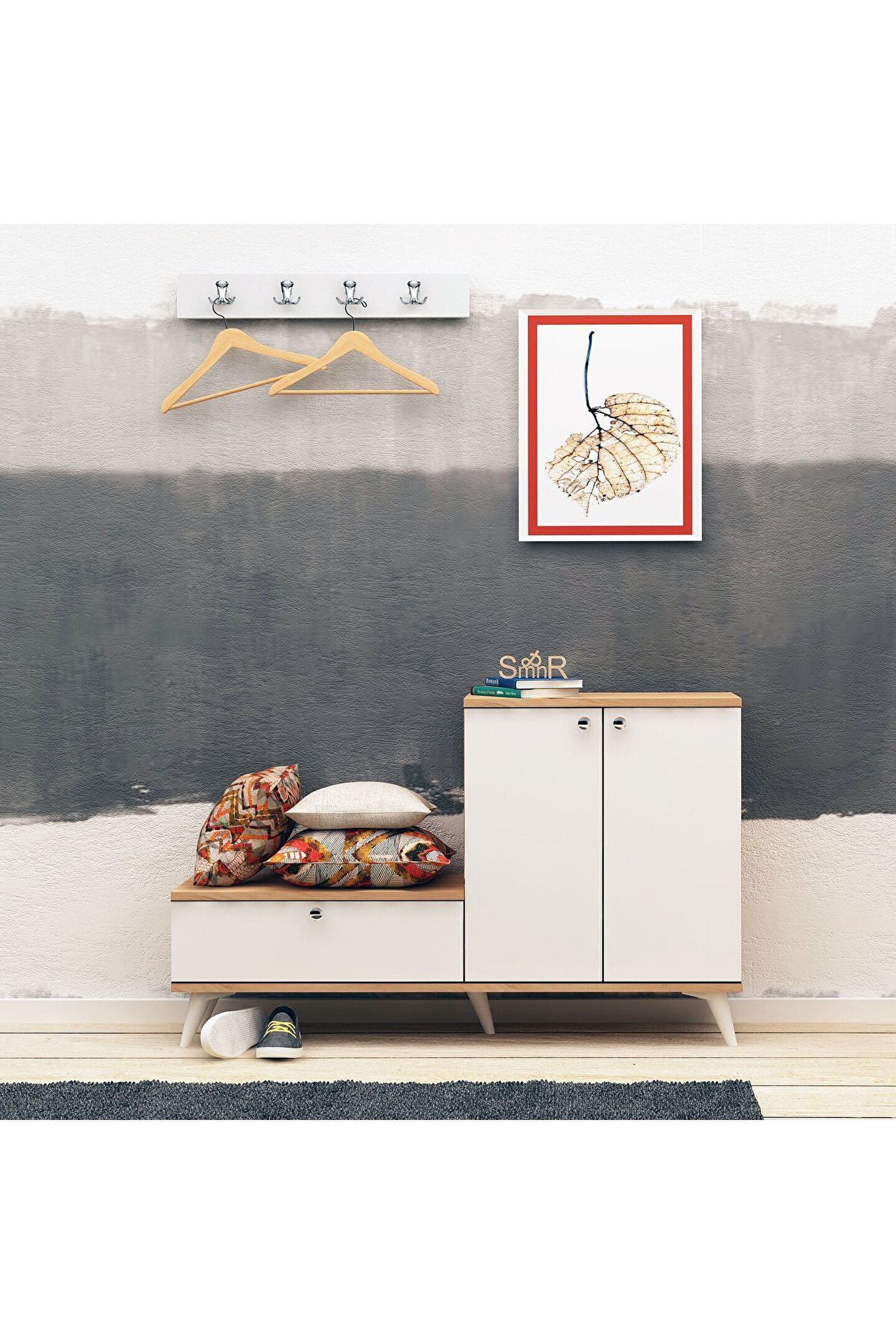 Askılık detayı da bulunan ayakkabılığın ölçüleri; yükseklik 76 cm, genişlik 120 cm ve derinlik 30 cm’dir.; Askılık ölçüleri; yükseklik 15 cm, genişlik 60 cm ve derinlik 1,8 cm’dir.; Ayakkabılık, zarif ve şık bir tasarıma sahip olup beyaz rengin zarafetiyle öne çıkar.; Ayakkabıların düzenli ve temiz bir şekilde saklanmasını sağlamak için özel olarak tasarlanmış olan ayakkabılık ve askılık takımı, ev girişlerine ferahlık ve düzen katar.; Beyaz rengin zarafetine meşe malzeme eklenerek doğal sıcaklık oluşur.; Meşe malzemenin sıcak tonları, ayakkabıların sergilenmesine estetik bir dokunuş katarken, beyaz renk de modern bir görünüm sağlar.; En üst düzey kalite standartlarına uygun olarak üretilerek içerisinde herhangi bir kanserojen madde bulundurmaz.; Anti-bakteriyel özellikleri sayesinde ayakkabıların hijyenik bir ortamda muhafaza etmeye yardımcı olur.; Çeşitli saklama seçenekleri sunan çok yönlü bir tasarıma sahiptir.; Dikey olarak tasarlanmış bir dolap, ayakkabıları sıralı ve düzenli bir şekilde saklamak için idealdir.; Böylelikle yerden tasarruf sağlar.; Yatay dolabı, ayakkabıları yan yana ve kolayca erişilebilir bir şekilde düzenlemeye olanak tanır.; Çift dolap sistemi, ihtiyaçlara ve evin düzenine uygun olarak ayakkabıları düzenli bir şekilde saklama esnekliği sunar.;