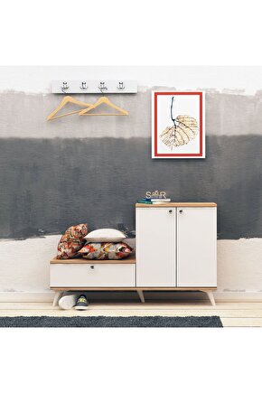 Askılık detayı da bulunan ayakkabılığın ölçüleri; yükseklik 76 cm, genişlik 120 cm ve derinlik 30 cm’dir.; Askılık ölçüleri; yükseklik 15 cm, genişlik 60 cm ve derinlik 1,8 cm’dir.; Ayakkabılık, zarif ve şık bir tasarıma sahip olup beyaz rengin zarafetiyle öne çıkar.; Ayakkabıların düzenli ve temiz bir şekilde saklanmasını sağlamak için özel olarak tasarlanmış olan ayakkabılık ve askılık takımı, ev girişlerine ferahlık ve düzen katar.; Beyaz rengin zarafetine meşe malzeme eklenerek doğal sıcaklık oluşur.; Meşe malzemenin sıcak tonları, ayakkabıların sergilenmesine estetik bir dokunuş katarken, beyaz renk de modern bir görünüm sağlar.; En üst düzey kalite standartlarına uygun olarak üretilerek içerisinde herhangi bir kanserojen madde bulundurmaz.; Anti-bakteriyel özellikleri sayesinde ayakkabıların hijyenik bir ortamda muhafaza etmeye yardımcı olur.; Çeşitli saklama seçenekleri sunan çok yönlü bir tasarıma sahiptir.; Dikey olarak tasarlanmış bir dolap, ayakkabıları sıralı ve düzenli bir şekilde saklamak için idealdir.; Böylelikle yerden tasarruf sağlar.; Yatay dolabı, ayakkabıları yan yana ve kolayca erişilebilir bir şekilde düzenlemeye olanak tanır.; Çift dolap sistemi, ihtiyaçlara ve evin düzenine uygun olarak ayakkabıları düzenli bir şekilde saklama esnekliği sunar.;