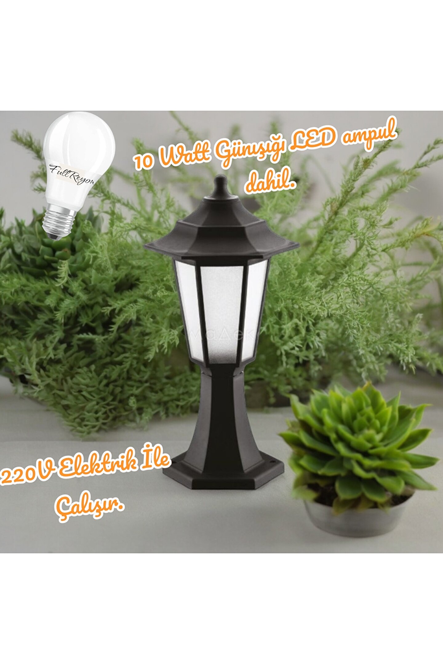 - Rustik tasarımı ile bahçe ve dış mekanlarınıza otantik bir hava katar; - E27 duy tipi sayesinde geniş bulunabilirlik ve kolay ampul değişimi sunar; - Dayanıklı plastik materyali ile uzun ömürlü kullanım ve kolay temizlik imkanı sağlar;
