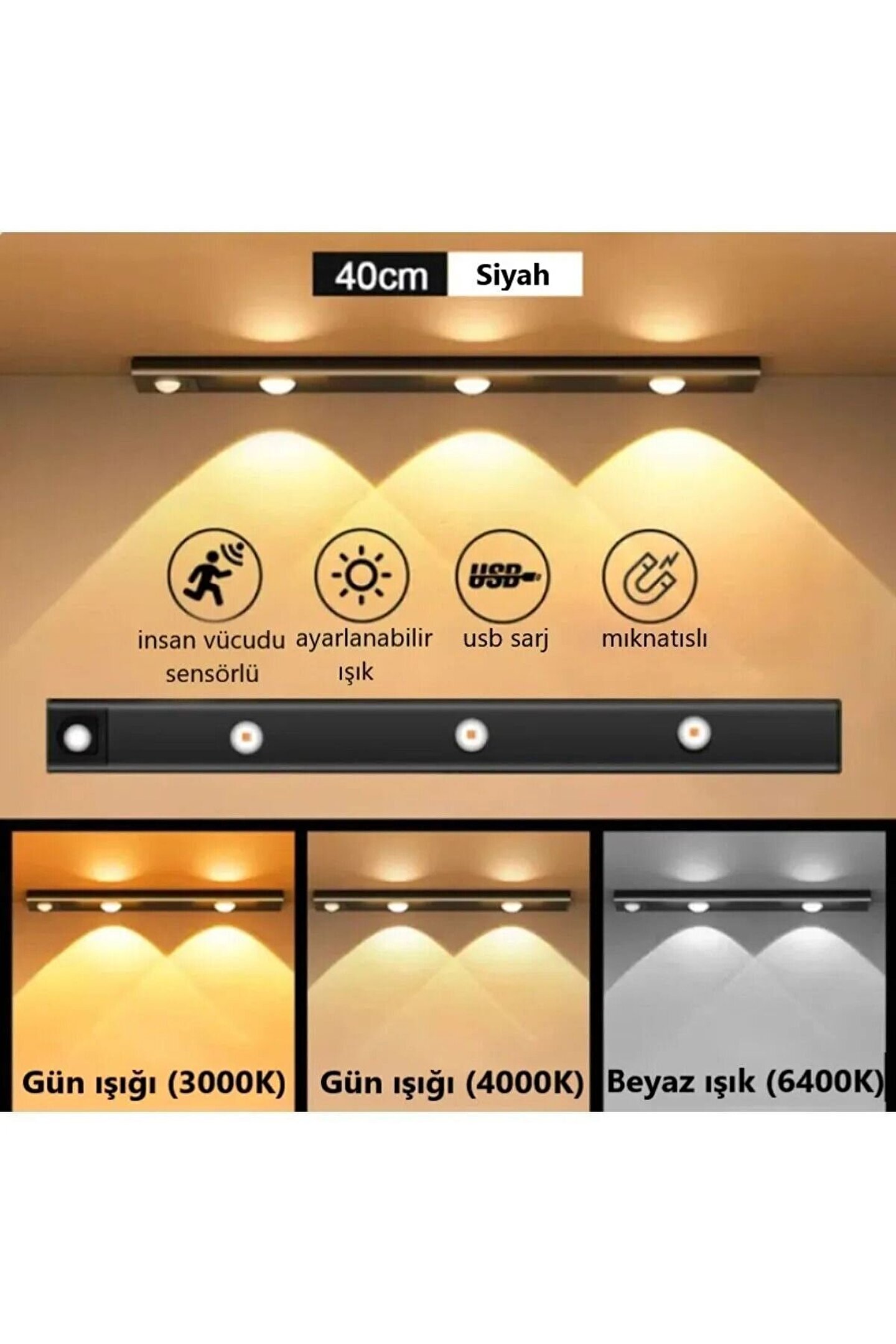 - Modern tasarımı ile evinizin dekorasyonuna şıklık katan, metal materyalden üretilmiş 2 adet 40cm hareket sensörlü gece lambası; - E14 duy tipi sayesinde geniş bir ampul yelpazesiyle uyumlu, kolayca değiştirilebilir ampul yapısı; - Harekete duyarlı sensör özelliği ile hareket algıladığında otomatik olarak açılıp kapanan pratik kullanım sunar; - USB şarj edilebilir özelliği ile elektrik prizine ihtiyaç duymadan, herhangi bir USB portu üzerinden kolayca şarj edilebilir;