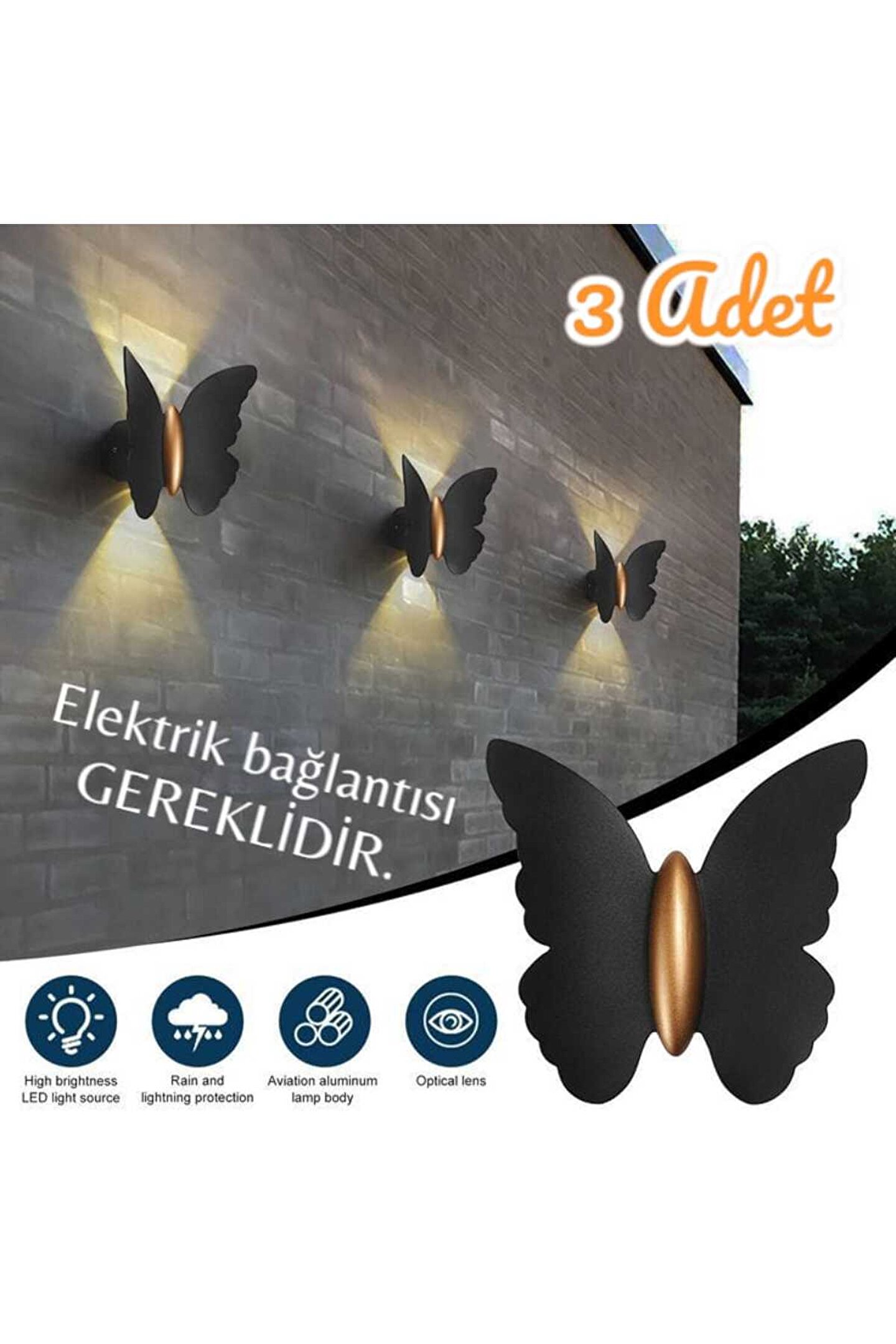 3 Adet Elektrikle Çalışır, 6 Watt Amber Işık Ledli Kelebek Duvar Aplik İç ve Dış Mekan IP65 Aplik