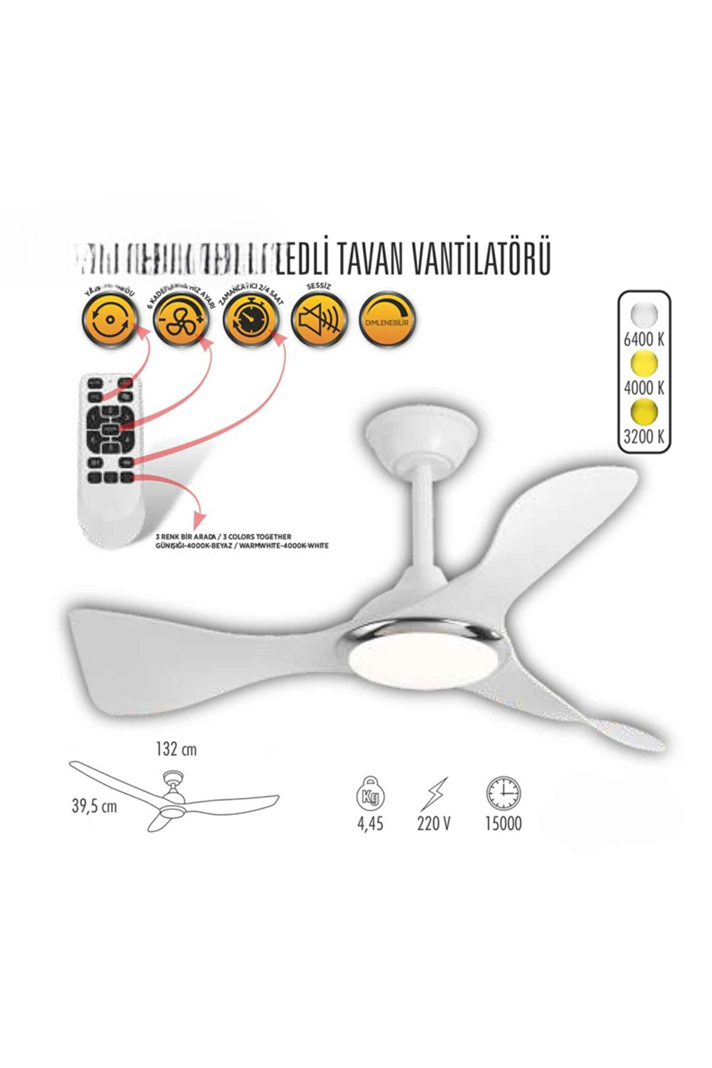 fullreyon 40 Watt, 3 Işık Modlu, 6 Kademeli, Kumandalı, Çok Şık ve Kaliteli Tavan Vantilatörü Ledli Vantilatör