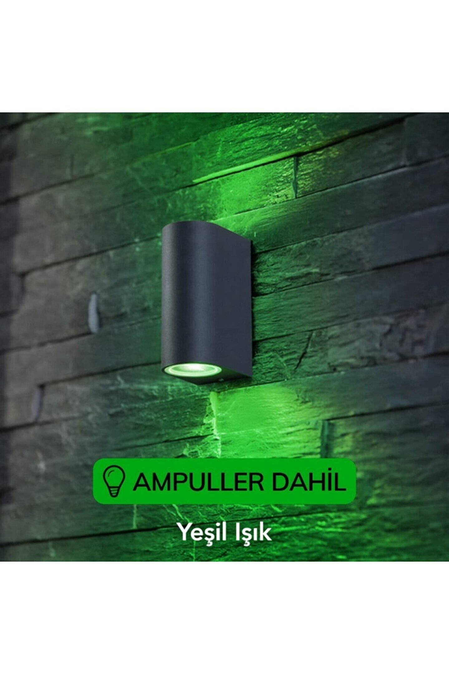 Full Reyon İmalatı; Yüzde Yüz Yerli Üretim Dekoratif Çift Yönlü Su Geçirmez Aplik; Yeşil Işık Ampuller Dahil İç ve dış mekan kullanımına uygundur; Ürün su geçirmez, mevsim şartlarından etkilenmez niteliktedir; 1; Kalite sert plastikten üretilmiş ürünümüz imalat aşamasında katılan bir içerik ile metale çok yakın bir görünüm almaktadır; Ürün Ölçüleri: 7 x 9 x 15 Cm Paket İçeriği: 1 Adet Antrasit Aplik; 2 Adet 7 Vat Gu10 Yeşil Işık; Led Ampul Ampul Özellikleri: A+ 7 kWh / 1000h Düşük enerji harcar; Ulrtaviyole Işın içermez; Civa içermez; Dim edilemez; AEEE yönetmeliğine uygundur; Ürünün montajından önce elektiriği kesiniz; 7 V 630 Lümen %85 Enerji Tasarrufu Model: GU10 Mercekli Güç: 7 W; Voltaj: 170; 265 V AC Frekans: 50; 60 HC;