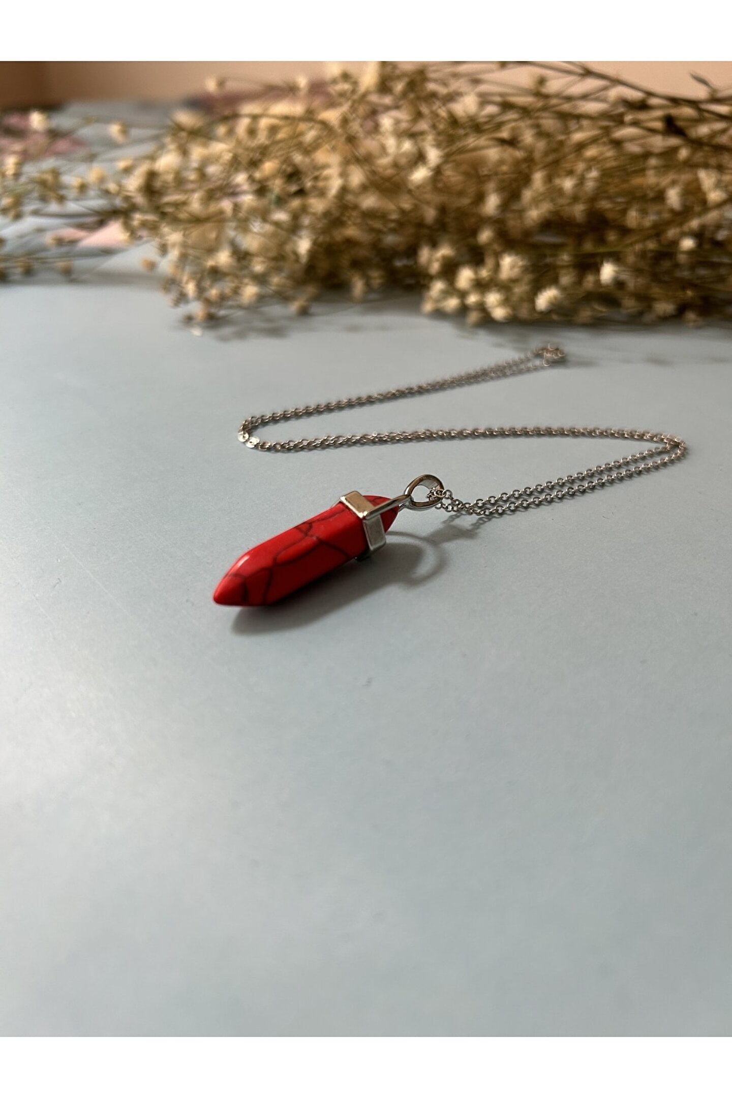 Kırmızı Firuze çivi kolye, doğal taşın sıcak ve canlı enerjisini üzerinizde taşırken, sizlere aşk, tutku ve cesaret gibi duyguları hatırlatacaktır. ; Kırmızı firuze taşının canlı ve çarpıcı rengi, herhangi bir kıyafeti anında canlandıracak ve sizlere dikkat çekici bir görünüm kazandıracaktır. ; Kendimize veya sevdiklerinize özel bir hediye olarak da tercih edebileceğiniz bu çivi kolye, enerji dolu bir stil be pozitif bir ruh hali sunar. ; Siz de doğal taşların gücünü hissetmek ve tarzınıza farklı bir dokunuş katmak için bu muhteşem kolyeyi seçebilirsiniz;