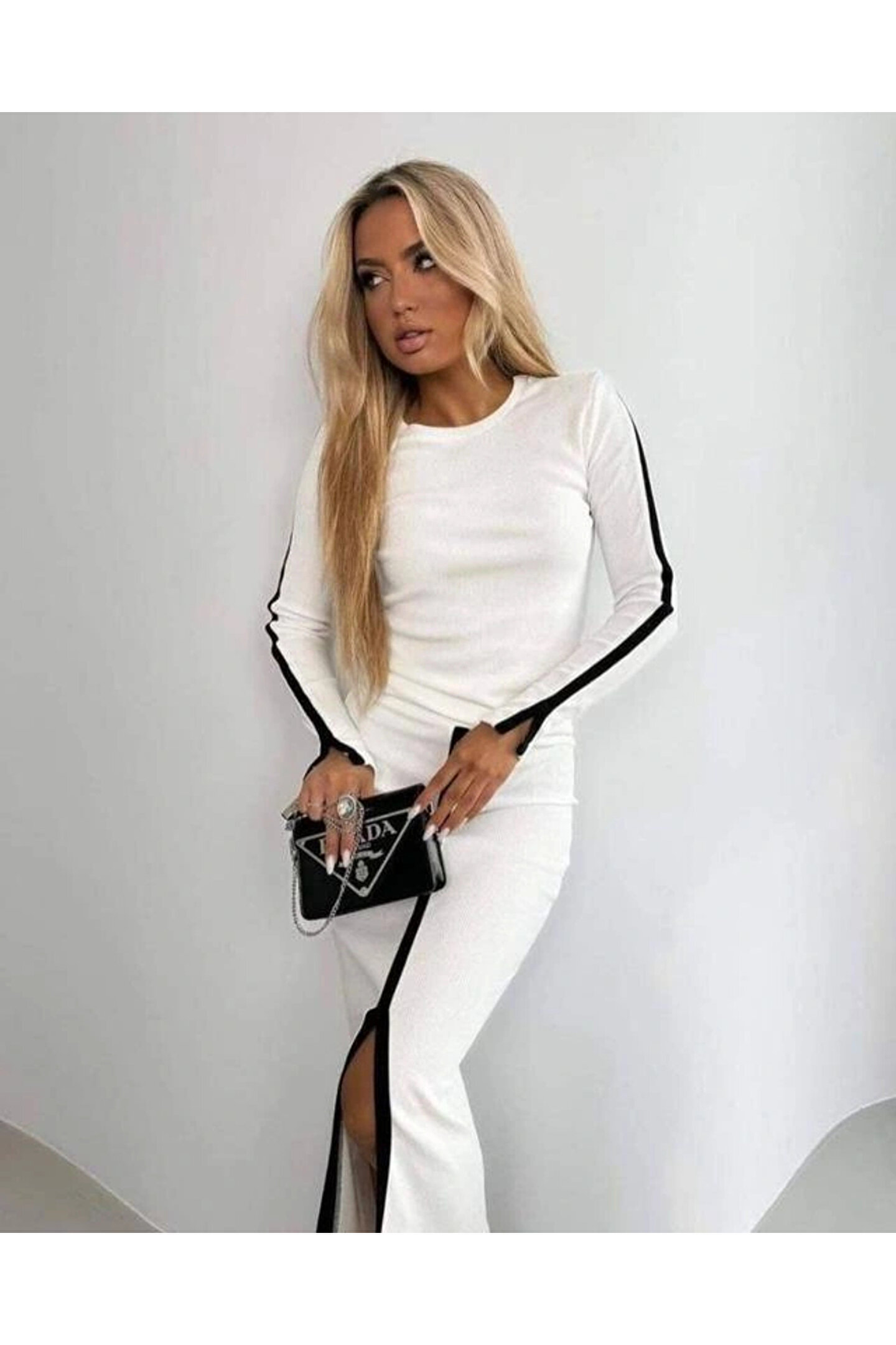 genelartp75 Kadın Uzun Kollu Bisiklet Yaka Kaşkorse Bluz Ve Yırtmaçlı Etek Ikili Takım