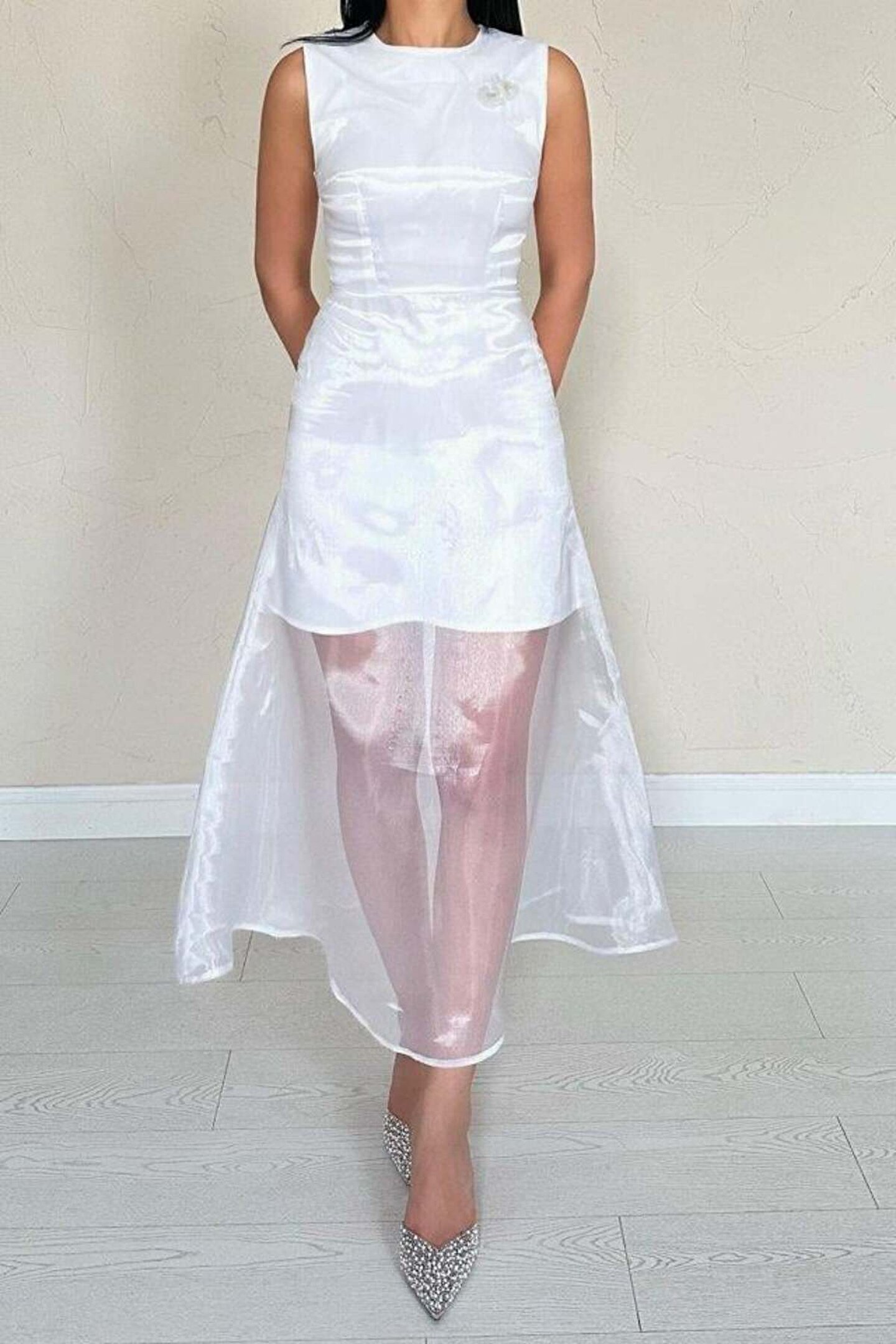 gl00my Beyaz Organze Detaylı Atlas Elbise