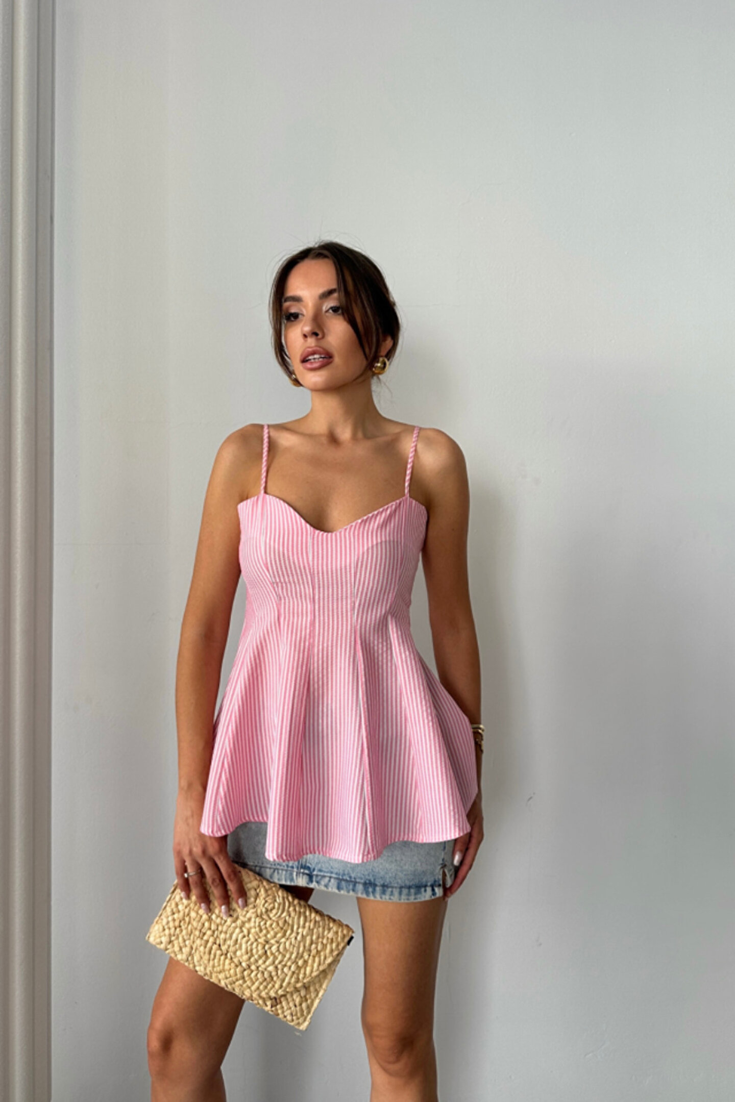 ÇİZGİLİ GOFRE ASKILI PENS DETAYLI BLUZ - Pembe