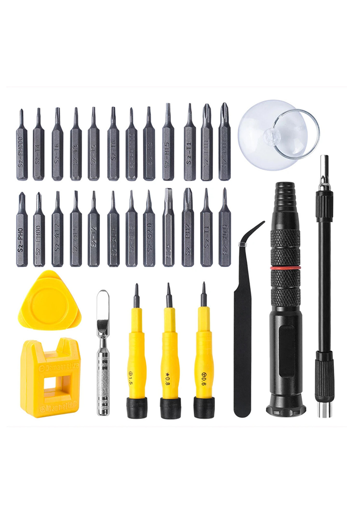 34 Uçlu Tamirci Tornavida Seti, her türlü tamir işi için gereken başlıca araçları içeren kapsamlı bir set olarak tasarlanmıştır. Profesyonel kalitede S2 alaşımlı çelikten üretilmiş 24 farklı tornavida başlığı ile donatılmıştır. Bu başlıklar, çeşitli boyutlarda ve tiplerde gelir, böylece çeşitli cihazlar, elektronik eşyalar, mobilyalar ve daha fazlası için uygun bir seçenek sunar.