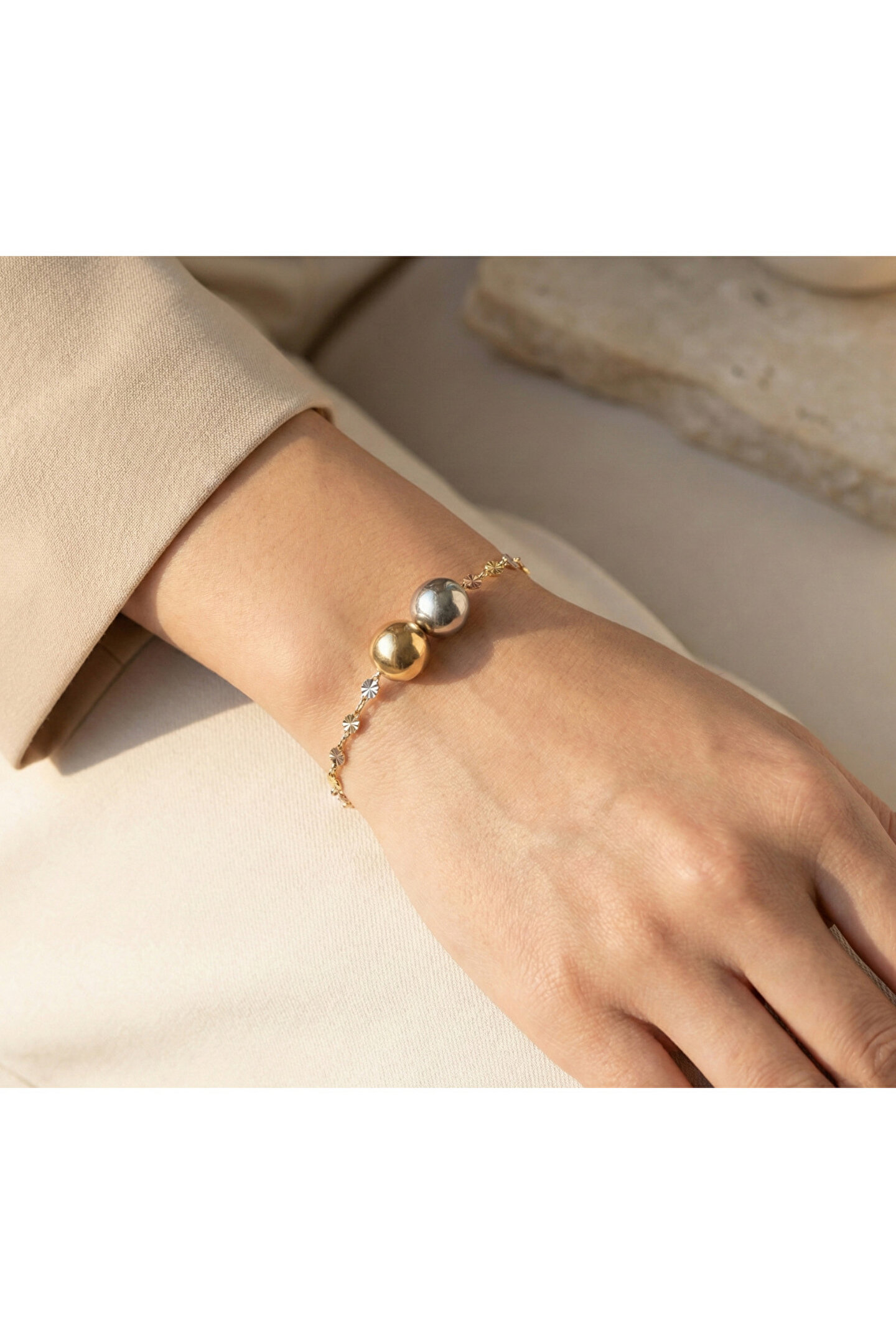 - Zarif tasarımıyla dikkat çeken çift toplu İtalyan bileklik, gümüş rengiyle şıklığınızı tamamlar; - Kaliteli malzeme kullanımı sayesinde uzun ömürlü ve dayanıklı bir aksesuar deneyimi sunar; - Çift toplu yapısı ile modern ve trend bir görünüm sağlar, her türlü kıyafetle kolayca uyum sağlar; - Hem günlük kullanım hem de özel günlerde tercih edebileceğiniz ideal bir aksesuardır.; toplar 10 mm.