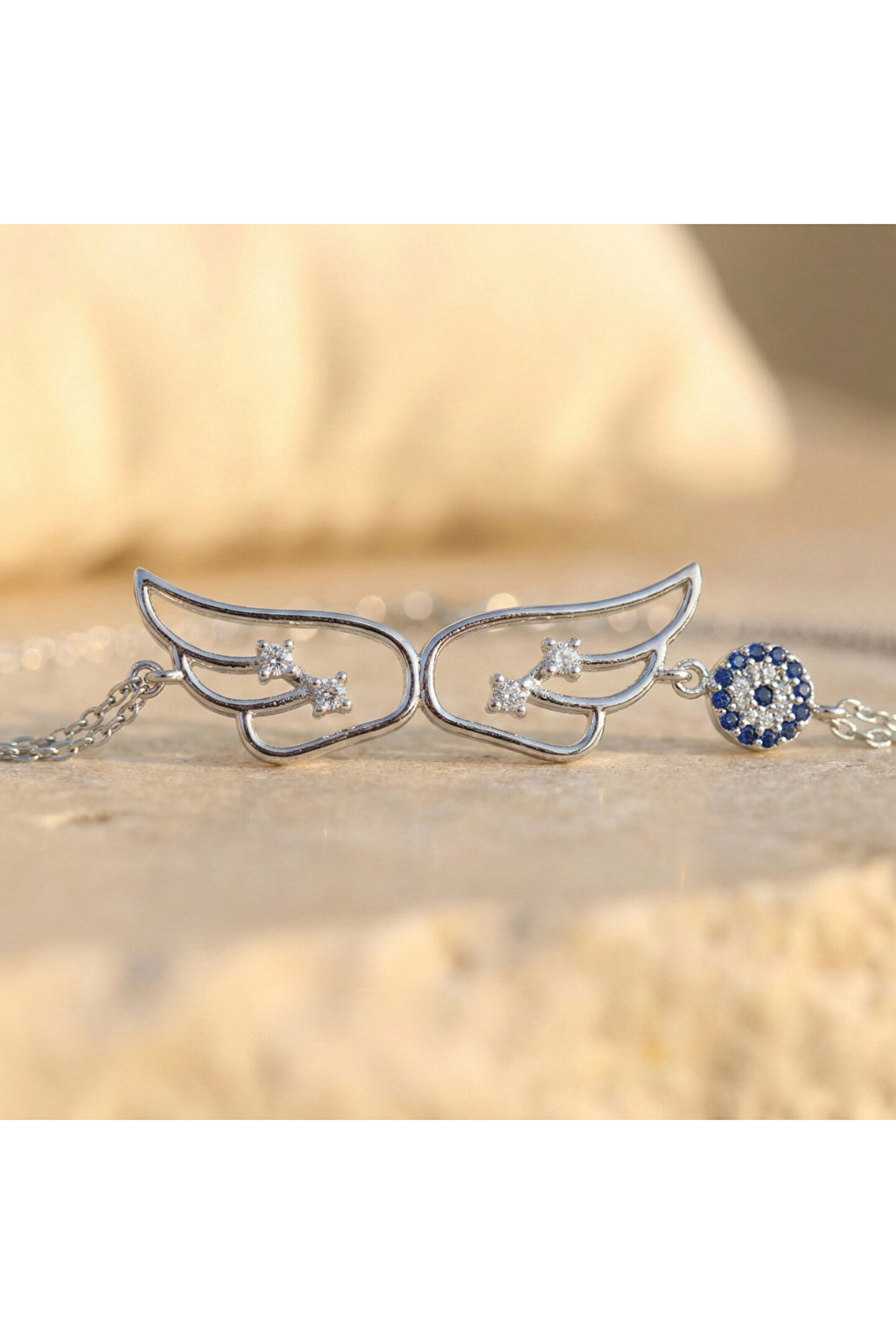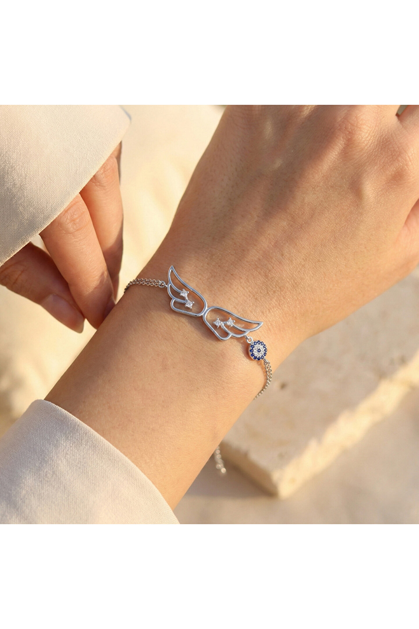 Zarif tasarımıyla dikkat çeken beyaz taşlı melek kanadı bileklik, gümüş rengi ve zirkon taş detaylarıyla göz alıcı bir görünüm sunar; Zirkon taş kullanımı sayesinde, bileklik hem şıklığı hem de parıltıyı bir arada barındırır ve her türlü özel gününüzde ışıltınızı ön plana çıkarır; Melek kanadı motifinin zarif çizgileri, bileklikte modern ve estetik bir dokunuş sağlar, günlük kullanım için idealdir; Gümüş rengi ile klasik ve zamansız bir tarz yaratırken, her türlü kıyafetle kolayca uyum sağlar.; Melek kanadı uzunluğu 11.35 mm, genişliği 38.10 mm, nazarın çapı 6.80 mm.