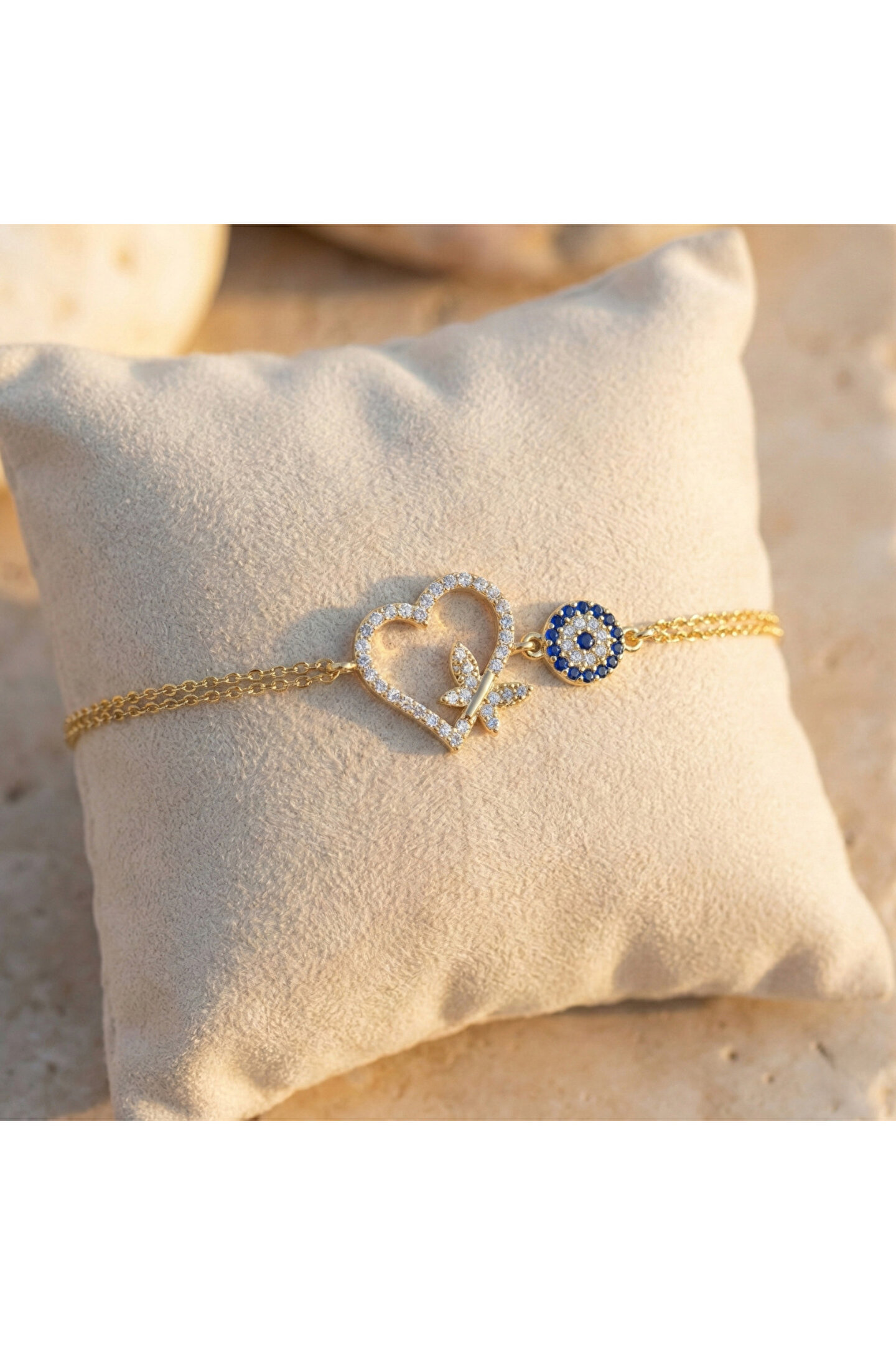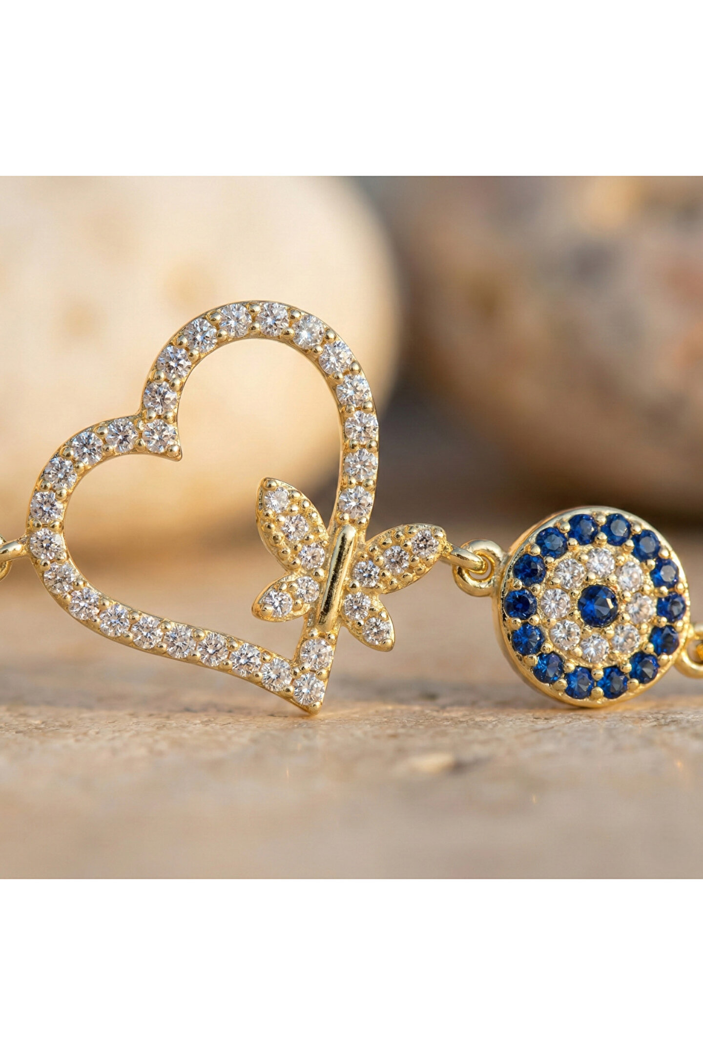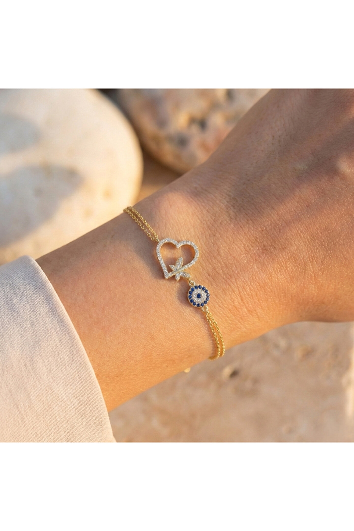 Zarif tasarımıyla dikkat çeken taşlı kelebekli kalp bileklik, gümüş rengi ve zirkon taş detaylarıyla göz alıcı bir görünüm sunar; Zirkon taş kullanımı sayesinde, bileklik hem şıklığı hem de parıltıyı bir arada barındırır ve her türlü özel gününüzde ışıltınızı ön plana çıkarır; Kalp şeklindeki tasarımıyla sevginin ve aşkın sembolü olan bu bileklik, anlamlı anlarınıza eşlik ederken zarafetiyle de stilinizi tamamlar; Gümüş rengi sayesinde farklı renklerle kolayca uyum sağlar ve çeşitli kıyafet kombinlerinizle mükemmel bir uyum yakalar.; Kalp parçasının boyu 16.40 mm, eni 19 mm, nazar parçasının çapı 6.80 mm`dir.
