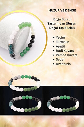 Boğa burcu taşlarından oluşan bu bileklik, hem şıklığı hem de enerjiyi bir arada sunar; Doğal taş kullanımı sayesinde her bileklik benzersiz ve otantik bir görünüm kazanır; Huzur ve dengeyi simgeleyen bu aksesuar, günlük kullanım için idealdir; Doğal taş materyali ile cildinizle dost, alerji yapmayan bir yapıya sahiptir;