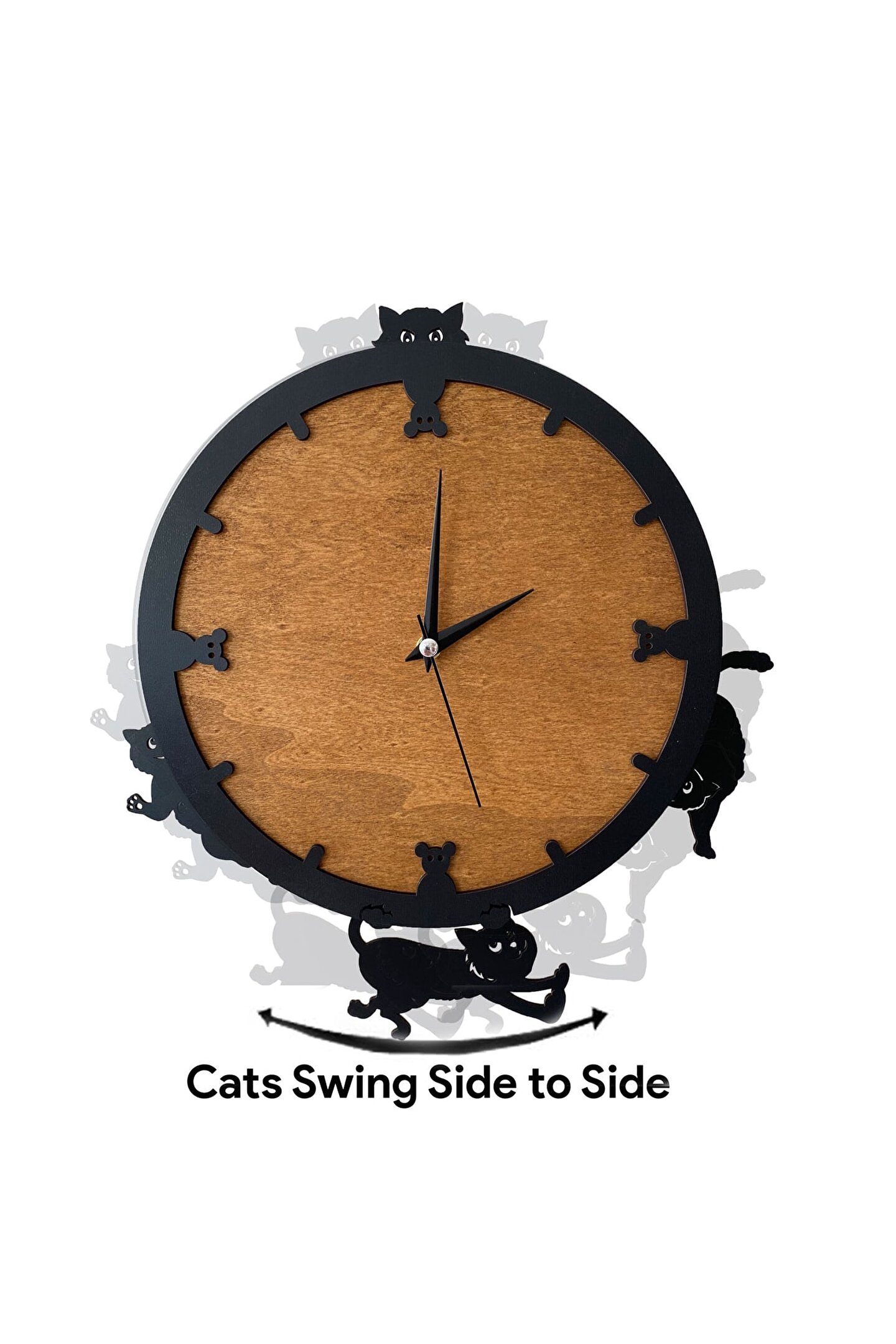 Goodtime dekoratif sallanır sarkaçlı kedi figürlü duvar saati ; Ürün özellikleri: ; - 1. Kalite Ahşap Mdf Malzemeden üretilmiştir. ; - Ürün tamamen el yapımıdır. (hand made) ; - 2 adet AA pil ile çalışır. ; - 1 adet pil, saati çalıştırır; diğer pil sarkacıhareket ettirir. ; - Her saniyede “Saat etrafındaki dört kedi”sağa solahareket eder. ; - Mekanizması yüksek kaliteli sessiz (quartz)çalışan akar saattir. ; - Saat üzerindeki akrep, yelkovan ve saniyemetal malzemedir. ; - Montaj şekli: Duvar çivisi ; - Montaja hazır özel askı aparatı ile bir çiviveya vidayla duvara kolayca sabitleyebilirsiniz. ; -Mutfak, oturma odası,çocuk odası,salon ve özel günlerinizde hediye olarak tercih edebileceğiniz dekoratif duvar saatidir. ; Ürün ebatları: ; Sarkaç DahilYükseklik: 32 cm ; Sarkaç DahilGenişlik : 32 cm ; Saat Gövde Çapı: 26 cm ; Derinlik : 6 cm ; Mdf Kalınlığı: 11 mm ;