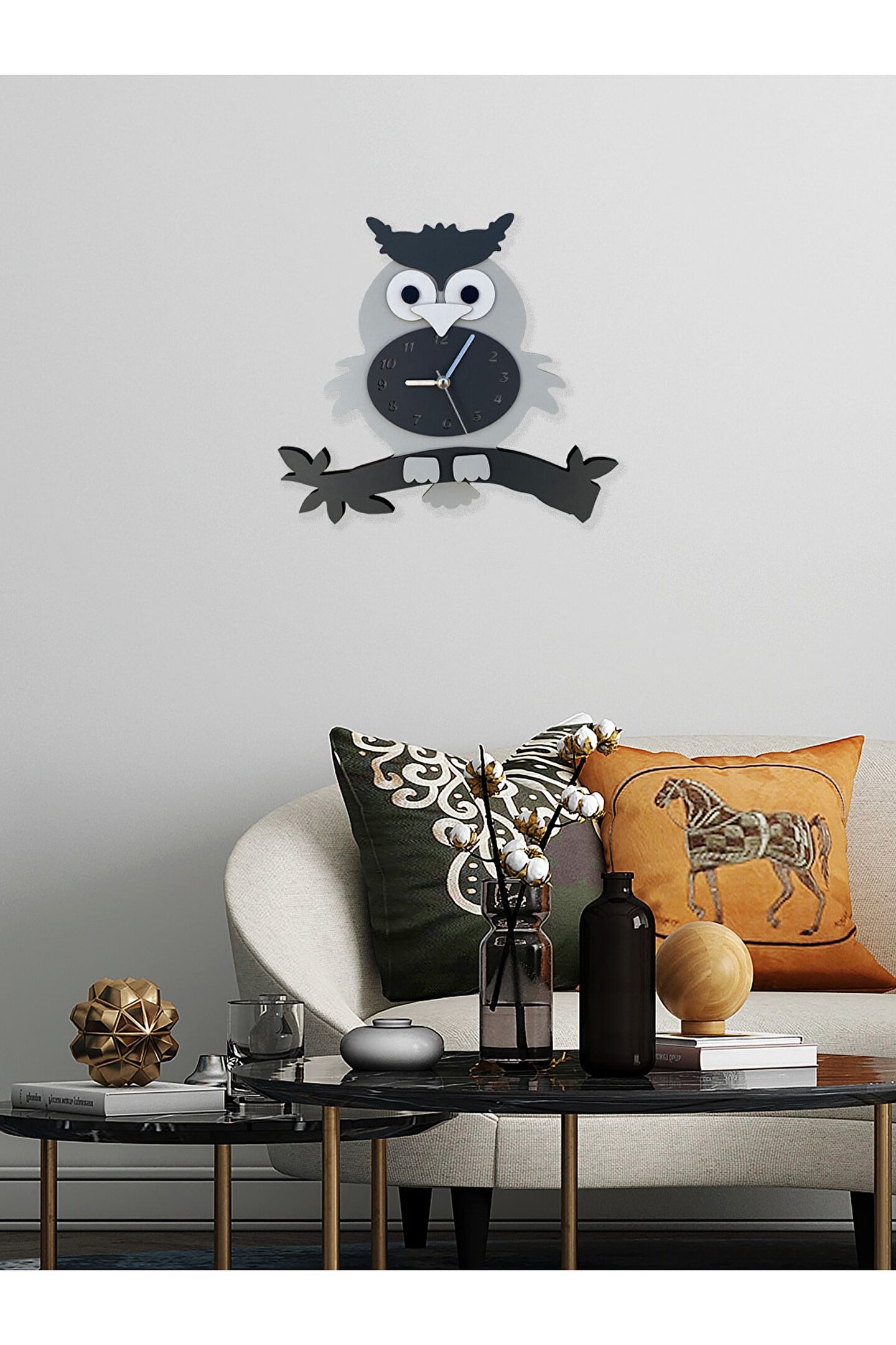 Goodtime Gri Baykuş Sarkaçlı Dekoratif Duvar Saati ; Ürün özellikleri: ; - 1. Kalite Ahşap Mdf Malzemeden üretilmiştir. ; - Ürün tamamen el yapımı (hand made) ve elboyaması ile üretilmektedir. ; - 2 adet AA pil ile çalışır. ; - 1 adet pil, saati çalıştırır; diğer pil sarkacıhareket ettirir. ; - Her saniyede “ Kuyruk ” sağa solahareket eder. ; - Mekanizması yüksek kaliteli sessiz (quartz)çalışan akar saattir. ; - Saat üzerindeki akrep, yelkovan ve saniyemetal malzemedir. ; - Montaj şekli: Duvar çivisi ; - Montaja hazır özel askı aparatı ile bir çiviveya vidayla duvara kolayca sabitleyebilirsiniz ; -Mutfak, oturma odası,çocuk odası,salon ve özel günlerinizde hediye olarak tercih edebileceğiniz dekoratif duvar saatidir. ; ; Ürün ebatları: ; Yükseklik: 25 cm ; Genişlik: 29 cm ; Derinlik: 6 cm ; Mdf Kalınlığı: 3,3 cm ; ;