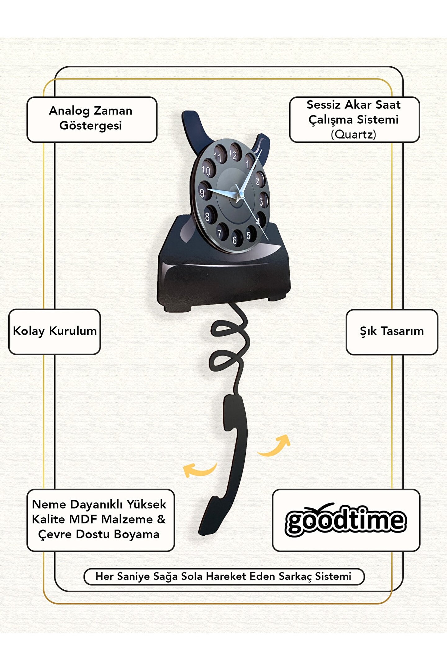 Goodtime Nostaljik Telefon Dekoratif Sarkaçlı Duvar Saati ; Lütfen taklitlerden kaçınınız. Saatin markası "goodtime" dır. ; Ürün özellikleri: ; - 1. Kalite Ahşap Mdf Malzemeden üretilmiştir. ; - Ürün tamamen el yapımı (hand made) olup,yüksek kaliteli baskı ile üretilmektedir. ; - 2 adet AA pil ile çalışır. ; - 1 adet pil, saati çalıştırır; diğer pil sarkacıhareket ettirir. ; - Her saniyede “Telefon Ahizesi” sağa solahareket eder. ; - Mekanizması yüksek kaliteli sessiz (quartz)çalışan akar saattir. ; - Saat üzerindeki akrep, yelkovan ve saniyemetal malzemedir. ; - Montaj şekli: Duvar çivisi ; - Montaja hazır özel askı aparatı ile bir çiviveya vidayla duvara kolayca sabitleyebilirsiniz. ; -Mutfak, oturma odası,çocuk odası,salon ve özel günlerinizde hediye olarak tercih edebileceğiniz dekoratif duvar saatidir. ; Ürün ebatları: ; Sarkaç Dahil Yükseklik: 50 cm ; Genişlik : 24 cm ; Derinlik : 4 cm ;