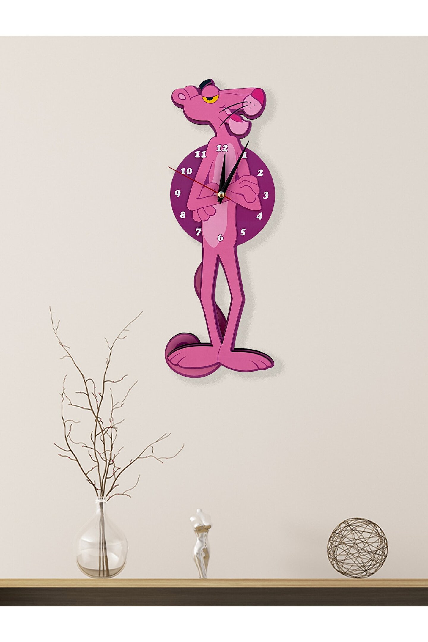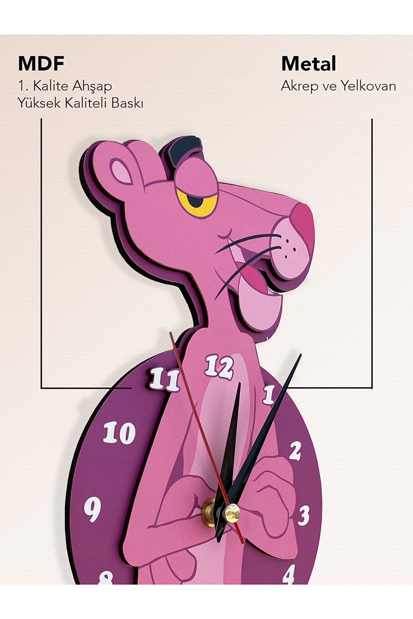 Goodtime Pembe Panter Dekoratif Duvar Saati ; ; Lütfen taklitlerden kaçınınız. Saatin markası "goodtime" dır. ; ; ; Ürün özellikleri: ; - 1. Kalite Ahşap Mdf Malzemeden üretilmiştir. ; - Ürün tamamen el yapımı (hand made) olup,yüksek kaliteli baskı ile üretilmektedir. ; - 2 adet AA pil ile çalışır.- 1 adet pil, saati çalıştırır; diğer pil sarkacıhareket ettirir. ; - Her saniyede “ Kuyruk ” sağa solahareket eder. ; - Mekanizması yüksek kaliteli sessiz (quartz)çalışan akar saattir. ; - Saat üzerindeki akrep, yelkovan ve saniyemetal malzemedir. ; - Montaj şekli: Duvar çivisi ; - Montaja hazır özel askı aparatı ile bir çiviveya vidayla duvara kolayca sabitleyebilirsiniz. ; -Mutfak, oturma odası,çocuk odası,salon ve özel günlerinizde hediye olarak tercih edebileceğiniz dekoratif duvar saatidir. ; Ürün ebatları: ; Sarkaç Dahil Yükseklik: 40 cm ; Genişlik : 14 cm ; Derinlik : 4 cm ; Mdf Kalınlığı: 4 mm ;