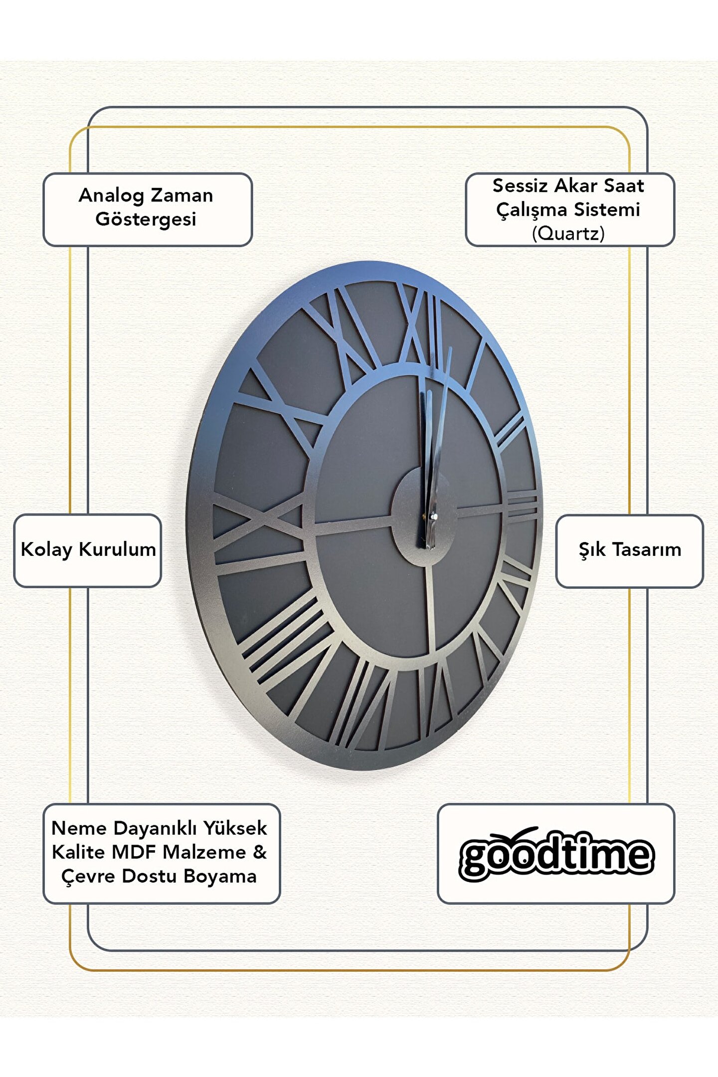 Goodtime Siyah Roma Dekoratif Duvar Saati 50x50 Cm ; Ürün özellikleri: ; - 1. Kalite Ahşap Mdf Malzemeden üretilmiştir. ; - Ürün tamamen el yapımı (hand made) ve elboyaması ile üretilmektedir. ; - 1 adet AA pil ile çalışır. ; - Mekanizması yüksek kaliteli sessiz (quartz)çalışan akar saattir. ; - Saat üzerindeki akrep ve yelkovan metalmalzemedir. ; - Montaj şekli: Duvar çivisi ; - Montaja hazır özel askı aparatı ile bir çiviveya vidayla duvara kolayca sabitleyebilirsiniz. ; Ürün ebatları: ; Saat Çapı : 50 cm dir. ; Derinlik : 5 cm ; Mdf Kalınlığı: 10 mm ;