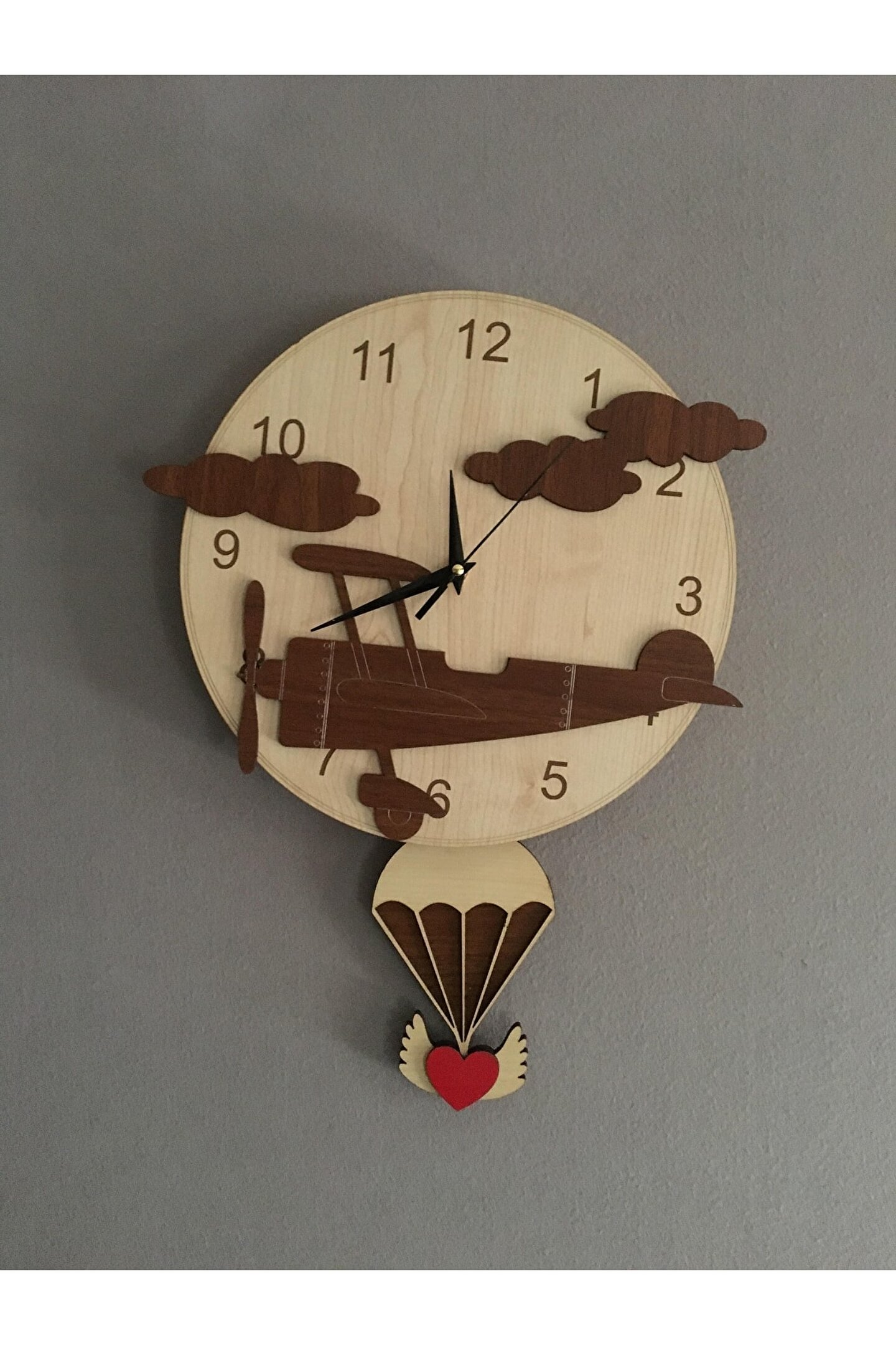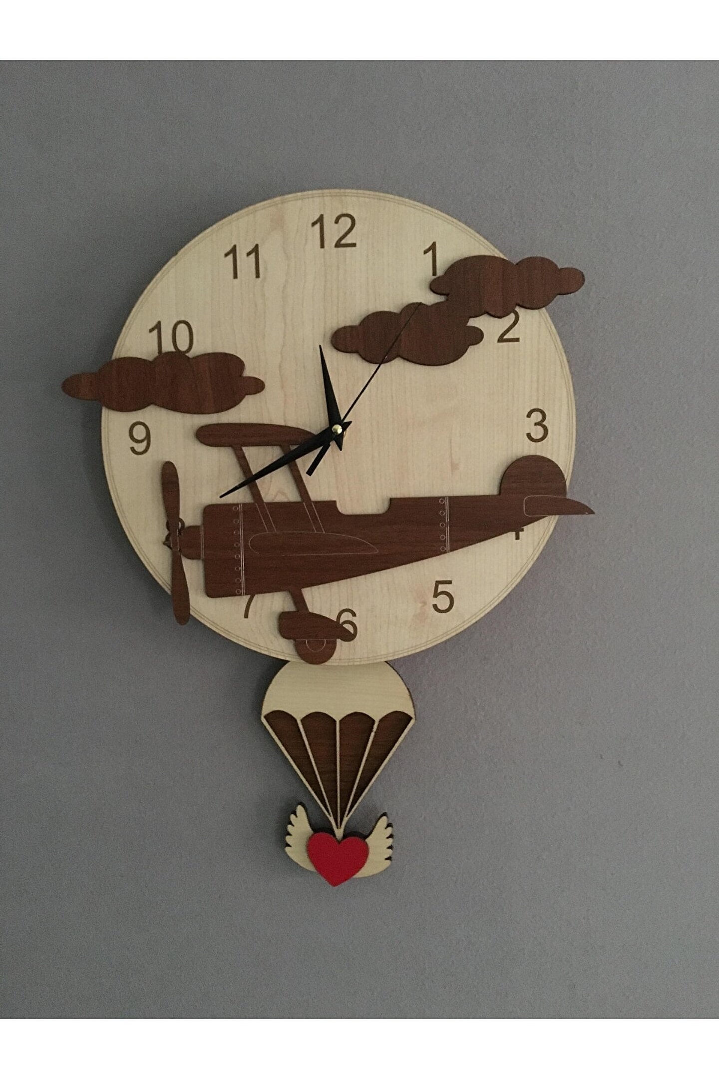 Goodtime Uçak Dekoratif Sarkaçlı Duvar Saati ; Lütfen taklitlerden kaçınınız. Saatin markası "goodtime" dır. ; Ürün özellikleri: ; - 1. Kalite Ahşap Mdf Malzemeden üretilmiştir. ; - Ürün tamamen el yapımıdır. (hand made) ; - 2 adet AA pil ile çalışır. ; - 1 adet pil, saati çalıştırır; diğer pil sarkacıhareket ettirir. ; - Her saniyede “Paraşüt” sağa sola hareketeder. ; - Mekanizması yüksek kaliteli sessiz (quartz)çalışan akar saattir. ; - Saat üzerindeki akrep, yelkovan ve saniyemetal malzemedir. ; - Montaj şekli: Duvar çivisi ; - Montaja hazır özel askı aparatı ile bir çiviveya vidayla duvara kolayca sabitleyebilirsiniz. ; -Mutfak, oturma odası,çocuk odası,salon ve özel günlerinizde hediye olarak tercih edebileceğiniz dekoratif duvar saatidir. ; Ürün ebatları: ; Sarkaç Dahil Yükseklik: 45 cm ; Genişlik : 32 cm ; Derinlik : 4 cm ; Mdf Kalınlığı: 4 mm ;
