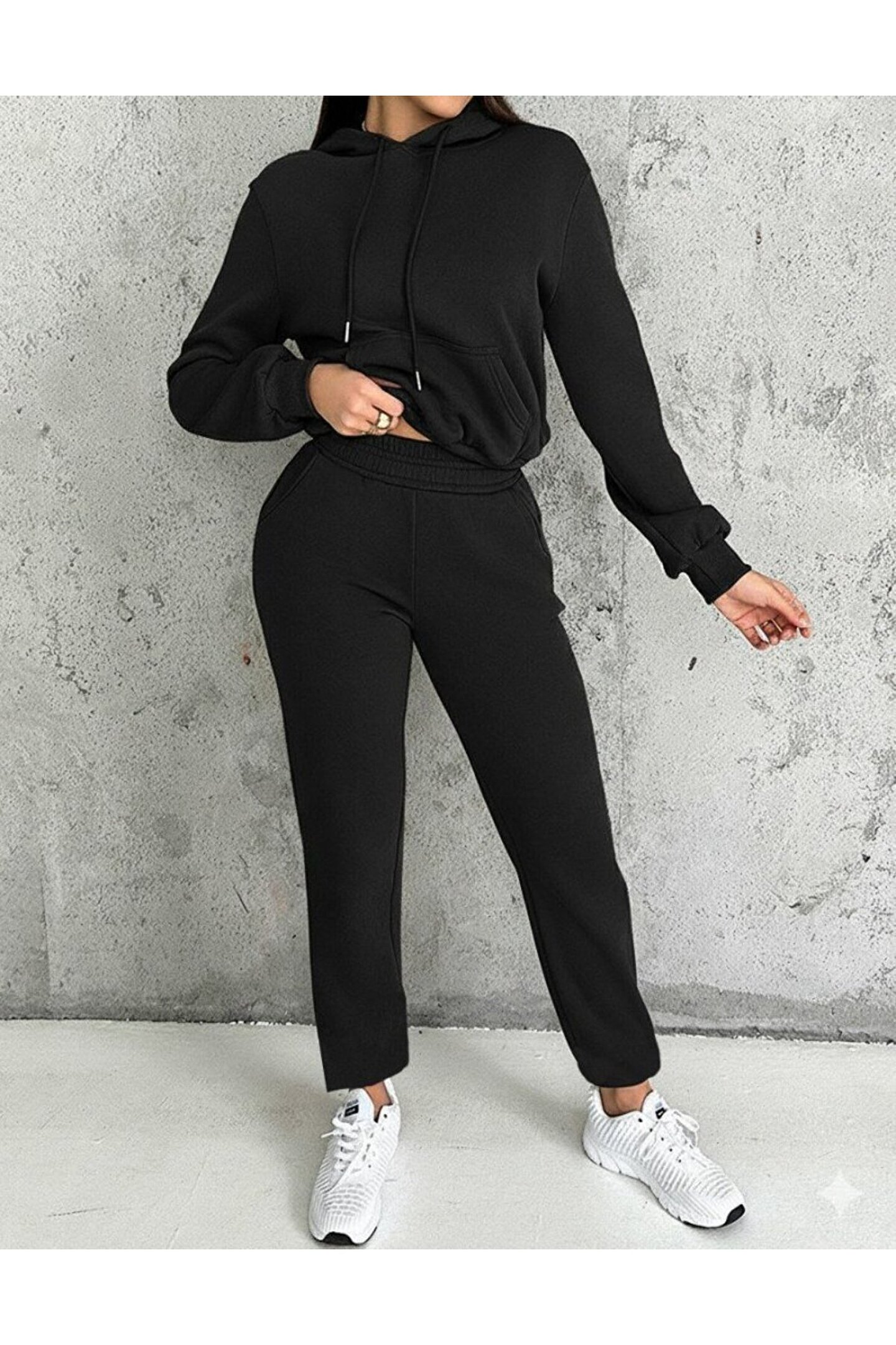 Kadın Uzun Kollu Kapşonlu Bağcıklı üç Iplik Bluz Ve Pantolon Ikili Takım