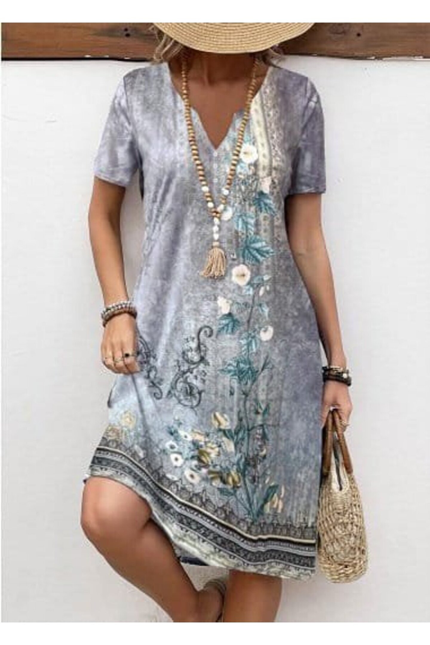 Kadın Kısa Kollu V Yakalı Desenli Süprem Elbise
