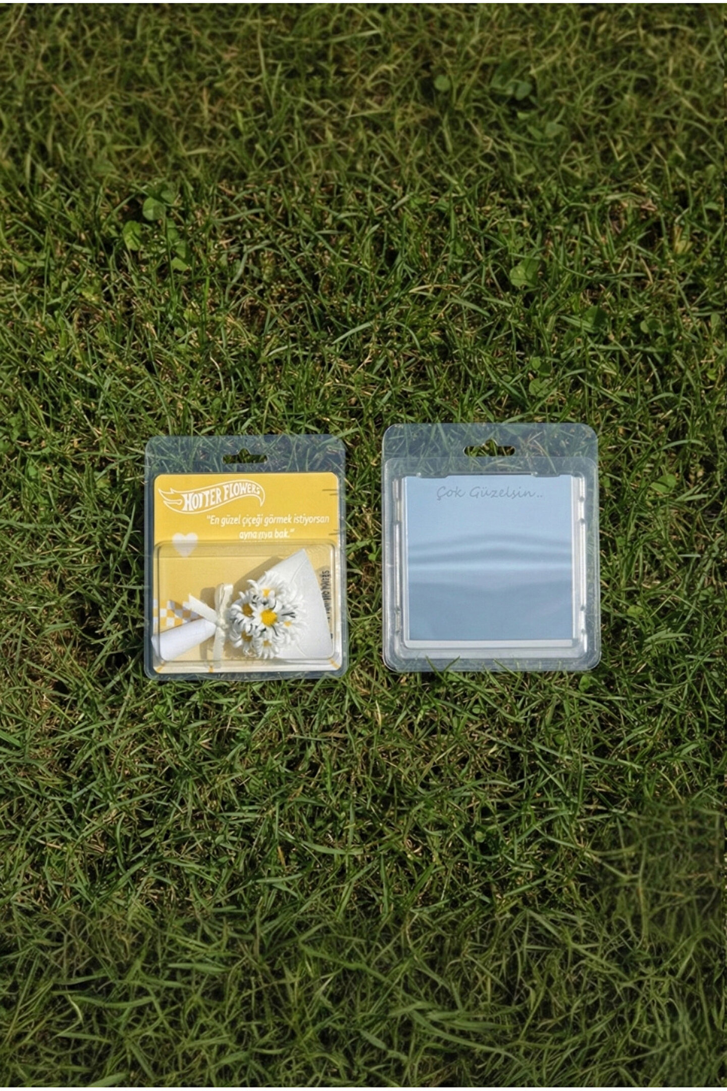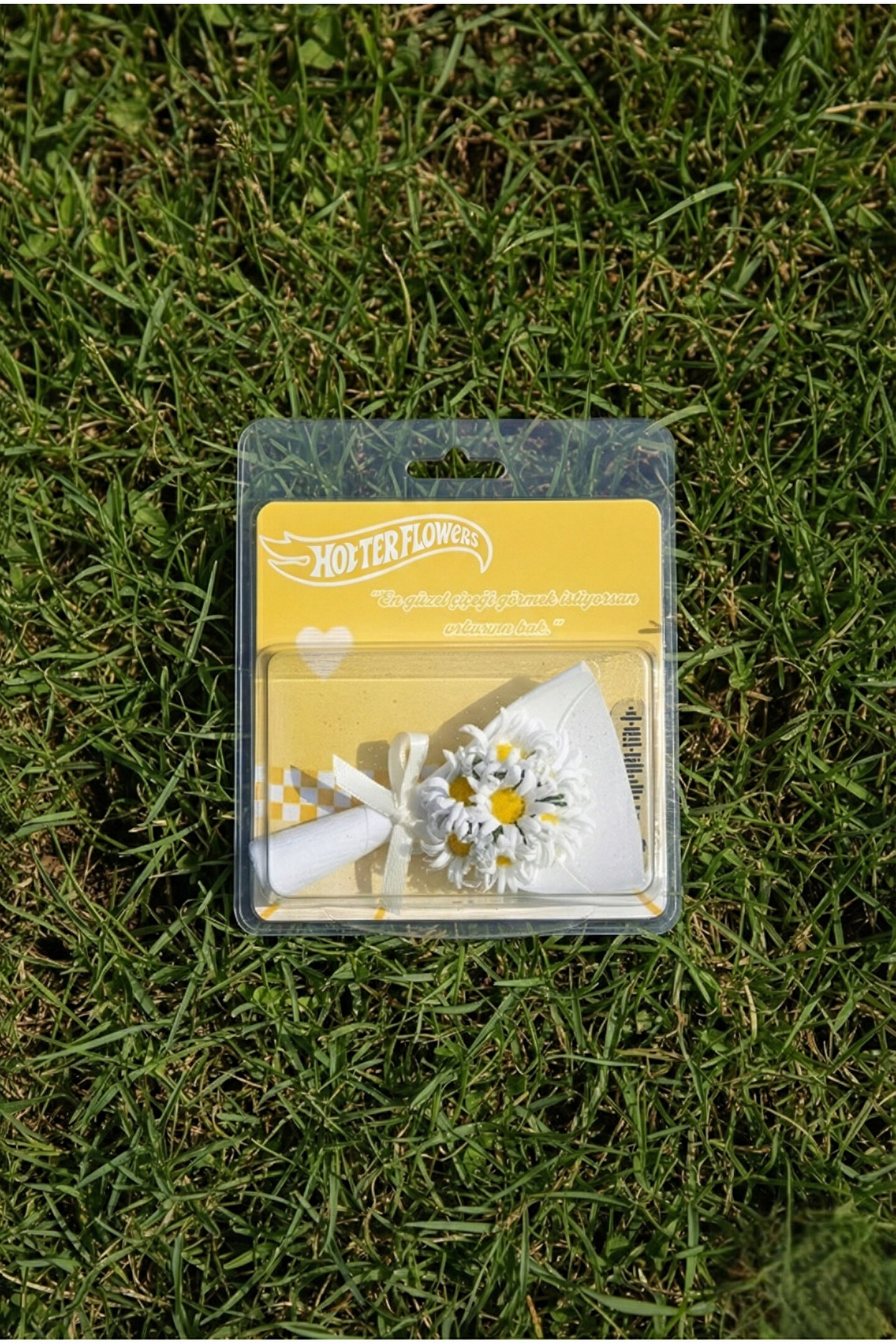 Gorgeous tarafından özel olarak tasarlanan bu koleksiyonluk aksesuar beyaz ve sarı tonlarının hâkim olduğu, özenle hazırlanmış yapay çiçek buketi ve şık süslemeleriyle dikkat çeker.; Ürün, görsel bütünlüğü bozulmadan sunulabilmesi için şeffaf koruma kutusu içerisinde ambalajlanmıştır.; Hem hediye olarak doğrudan sunulabilir hem de dekoratif amaçlı estetik bir tamamlayıcı unsur olarak kullanılabilir.;