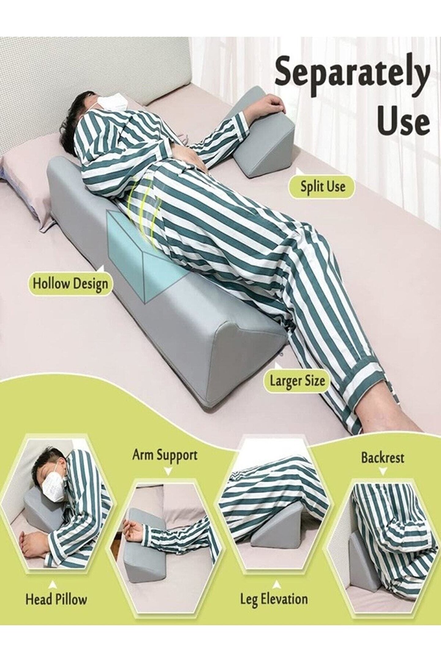 ?tıbbi köpük takoz?benzersiz tasarımı, birlikte ve ayrı ayrı kullanılmasına izin verir. ; Ortası oluklu olarak tasarlanmış büyük yastık daha nefes alabilir ve yatak yaralarını ve deri döküntülerini etkili bir şekilde önler. ; Küçük kama başı, elleri, dizleri ve bacakları destekleyebilir. ; ?su geçirmez pu deri? leke tutmayan dış malzeme, temiz bir havluyla kolayca temizlemenizi sağlar. ; Içerideki süngeri lekeleyen ter lekeleri veya içecekler hakkında endişelenmeyi bırakın, yastığınızı temiz ve hijyenik tutmaya yardımcı olun ve hemşirelik stresini azaltın. ; ?30 derece eğimli?büyük r şeklindeki kama yastık, vücudu kaldırmak için mükemmel bir eğim eğimi ile tasarlanmıştır. ; Basınç ülserlerini, yatak yaralarını etkili bir şekilde önleyin, ameliyat sonrası ağrıyı hafifletin ve yaranın hızla iyileşmesine yardımcı olun. ; Konumlandırma yatağı takozu?toplam boyut 34 x 12 x 7 inç, yüksek yoğunluklu köpüğe sahip iç kısım doğru sıkılığı ve uygun desteği sağlar, vücut konumlandırma, yatak yarası döndürme, bacak yükseltme, yan yatma ve hatta battaniye kaldırma için harikadır. ; ?geniş uygulama?yaşlılar, ameliyat sonrası insanlar, yatalak hastalar, engelliler, yandan uyuyanlar ve hamilelik için ideal hediyeler. ; Kullanıcılara vücut duruşunu değiştirin, hamile kadınların karnını destekleyin, basıncı azaltın ve daha iyi uyku kalitesi sağlayın..;